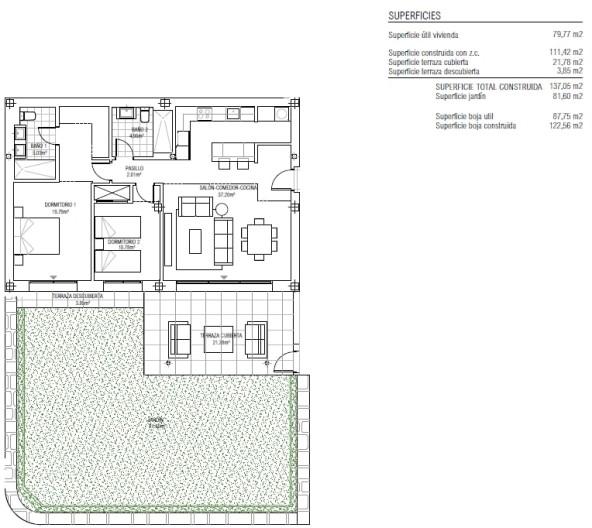 Rez de chaussée, non meublé, cuisine équipée, Underground parking, piscine communautaire, Jardin: Privé et commun, Orientation: Est