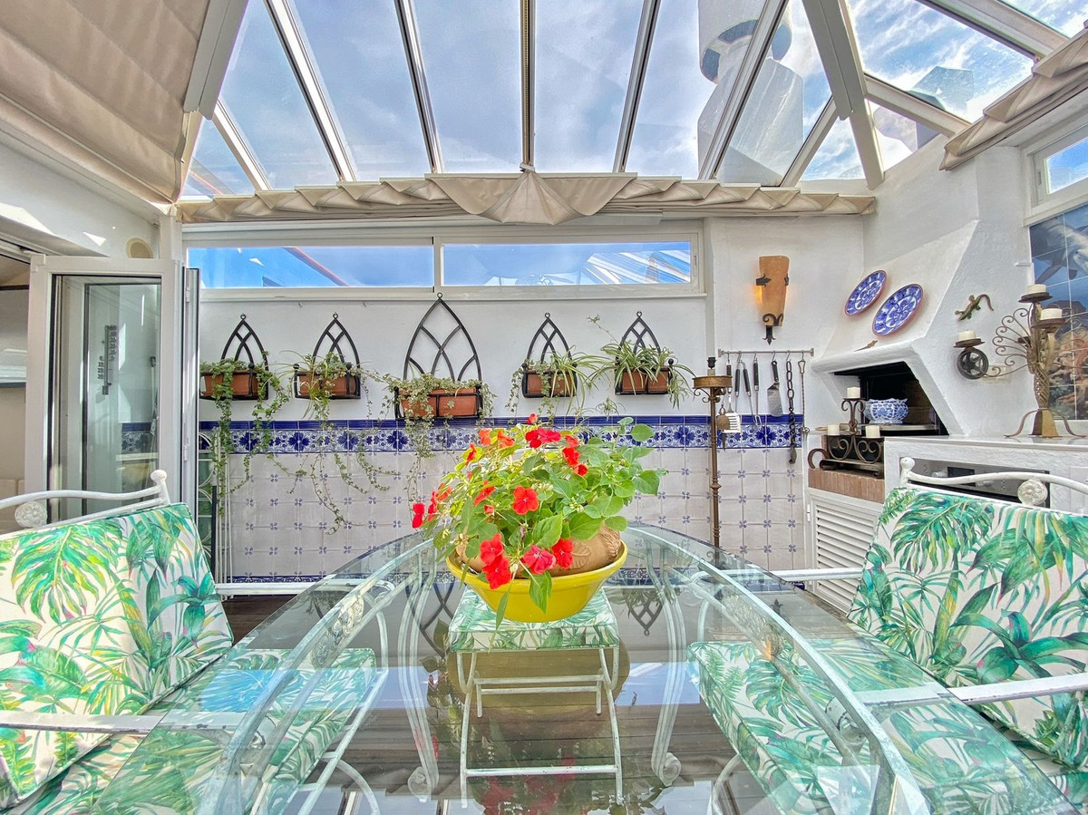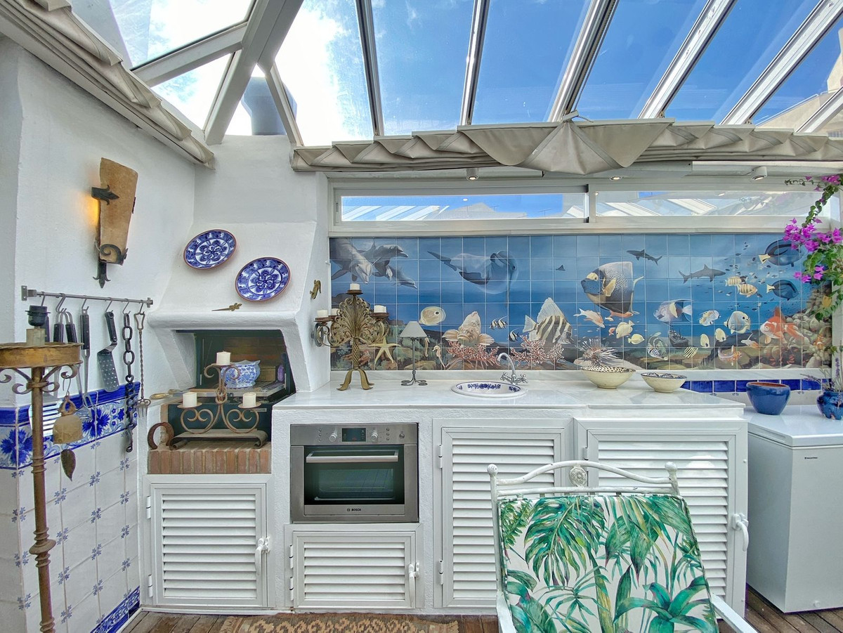 A fantastic terrace is covered by a dome with a glass roof, allowing for year-round use.