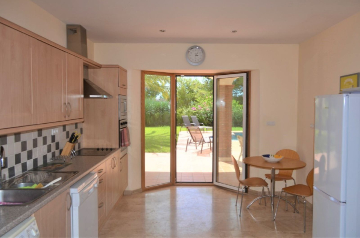The villa is built across 463m2 with a plot of 2197m2. As you enter the front door, on the east wing there are 3 double bedrooms and 2 bathrooms, a separate kitchen and very sunny large lounge. The west wing has another double bedroom, bathroom and additional area for a second lounge or office. On the first floor there is a large master bedroom, dressing area and large en suite leading out to a very secluded separate terrace. The gardens are well maintained with many fruit trees, excellent sized pool and parking up to 10 cars, with the addition of a double garage. The property is all on the flat and has disable access. The kitchen needs renovating. And the property comes unfurnished. The owner is open to offers.