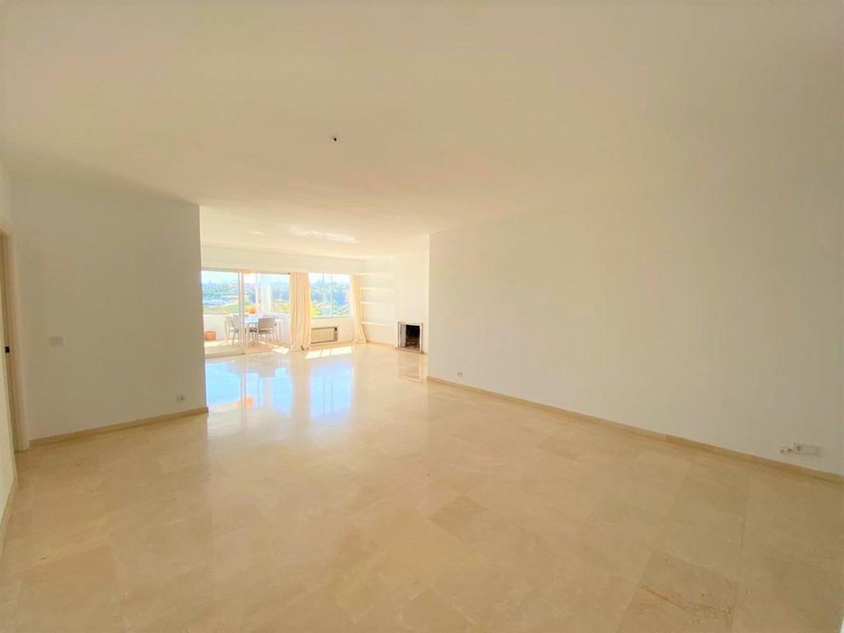 Impressive top-floor apartment surrounded by golf courses, with beautiful panoramic views. The home features a spacious and bright entrance hall, a 60 m² living-dining room with a fireplace and direct access to the terrace with open views of the sea and golf courses. There are 3 double bedrooms with en-suite bathrooms, all with large built-in wardrobes, a fully equipped kitchen, and a laundry area.