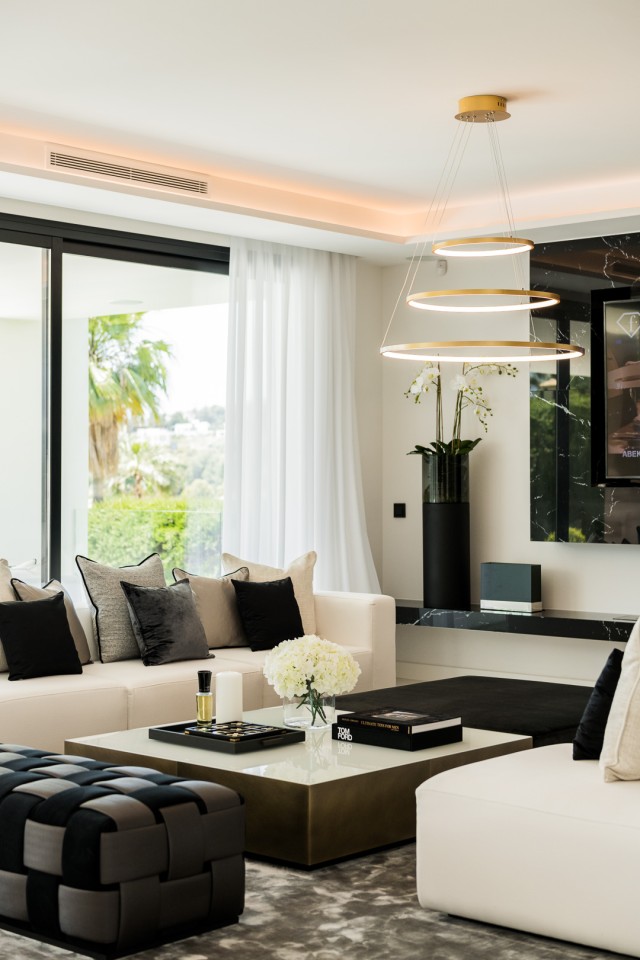 Répartie sur trois niveaux impeccablement conçus, cette villa dispose d'un grand hall d'entrée menant à un vaste espace de vie décloisonné, judicieusement divisé en trois coins salons distincts pour se divertir sans effort. Le cœur de la maison est une cuisine design italienne ultramoderne, équipée d'appareils Gaggenau haut de gamme, parfaitement intégrée à une salle à manger élégante. De là, sortez sur un porche spacieux et plongez dans la beauté à couper le souffle des jardins paysagers, comprenant une superbe zone de détente avec des jeux d'eau tranquilles, une très grande piscine chauffée avec une douche extérieure accueillante et suffisamment d'espace pour se prélasser. sous le soleil de la Méditerranée. Une cuisine barbecue extérieure complète cette oasis en plein air, offrant le cadre idéal pour des délices culinaires avec en toile de fond une vue panoramique sur le parcours de golf.