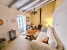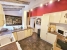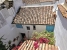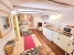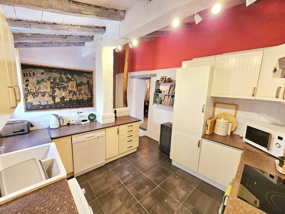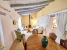 Stair Ascends to the first floor, featuring a modern kitchen ( with little external staircase that goes into the large central patio -  with rustic wooden beamed ceilings, a modern bathroom, and a main living room with an open fireplace and dining area.