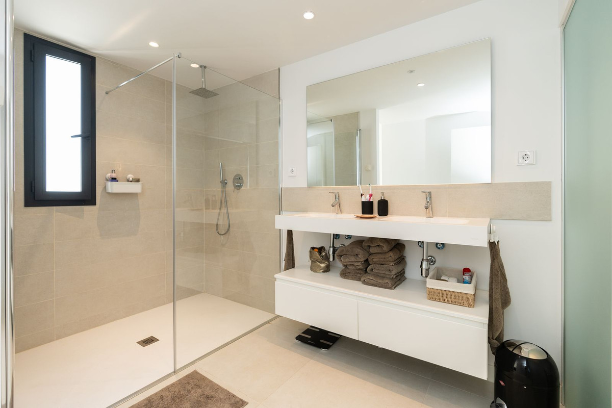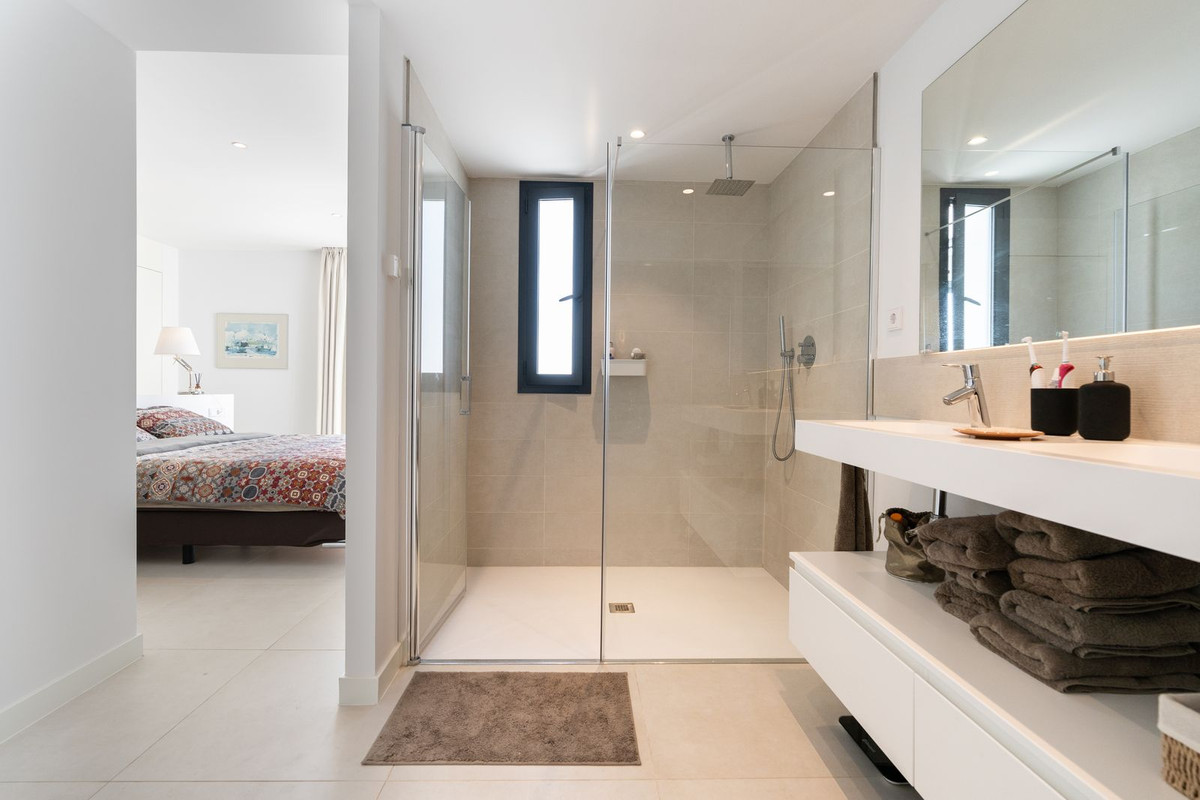 The large sliding doors provide easy access to the sunny terrace and also offer direct access to the luxurious adjacent saltwater swimming pool plus children's pool, you will experience peace and child friendliness here. The whole is situated in a subtropical garden surrounded by palm trees, sunbathing areas with sun beds and outdoor showers with views over the Mediterranean Sea and the mountains of Mijas.