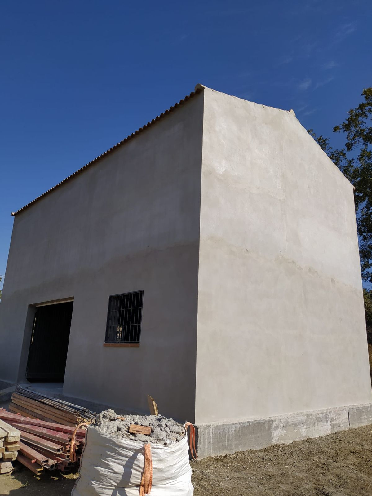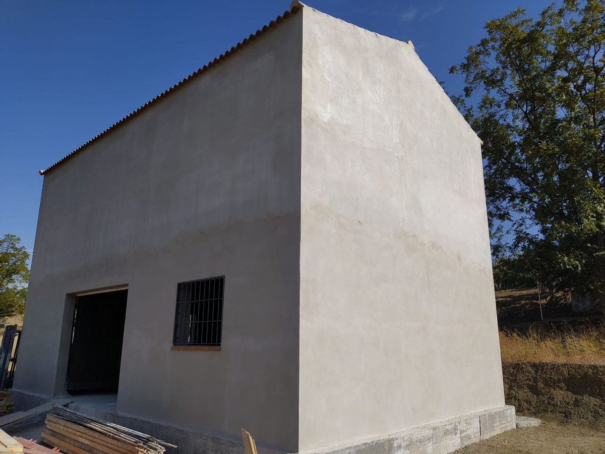 The property is accessed through two different entrances, both on paved roads, and enjoys proximity to the town, just seven minutes by car. The property offers the possibility of converting the warehouse into a two-story home in six years, with a planned layout of three bedrooms and two bathrooms.