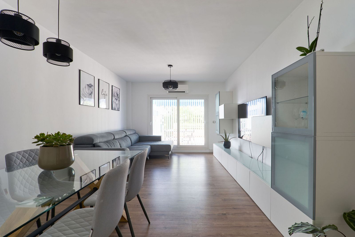 Cozy modern apartment with 3 bedrooms in the gated gated urbanisation on the first line of the sea. The urbanisation has a swimming pool for adults and children, tennis court. Ground floor with large terrace and private garden. Underground parking, storage room. Floors laminate, fully renovated. Close to all infrastructure - shops, stops, restaurants, beach, centre of Sabinillas