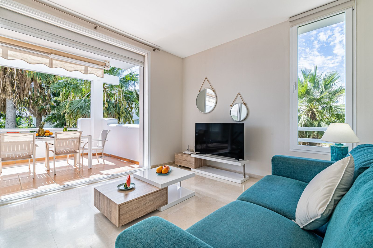 Designed to a high standard of quality and elegance, this flat features ample built-in wardrobes and an efficient hot/cold air conditioning system to ensure year-round comfort. The clever layout includes two bedrooms, one with en-suite bathroom, and an additional guest toilet. The heart of the property is undoubtedly its spacious living room, flooded with natural light thanks to its large glass doors. The kitchen, fully equipped with high quality appliances, offers an ideal environment for the home chef.