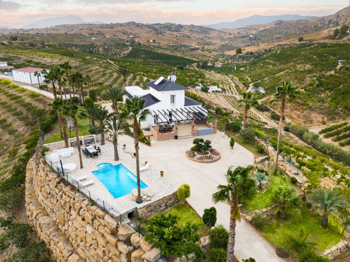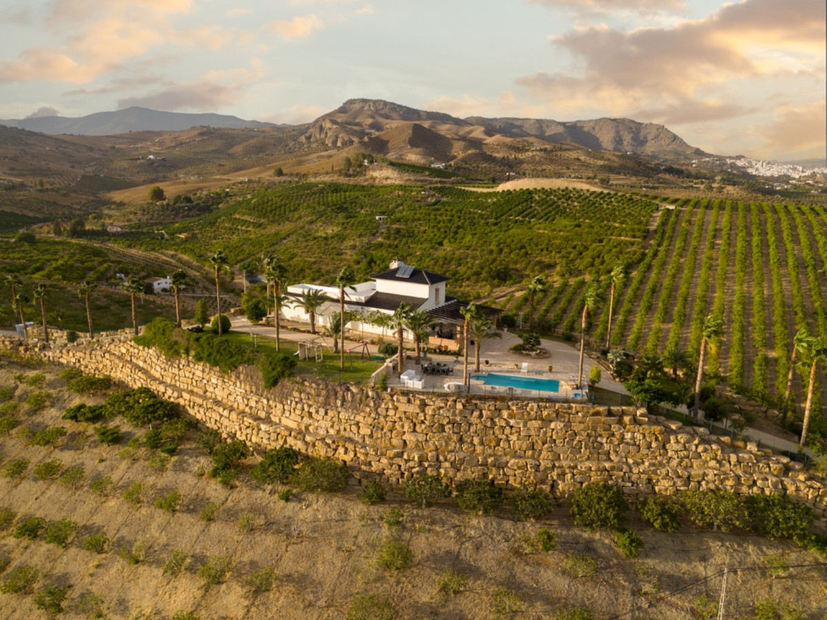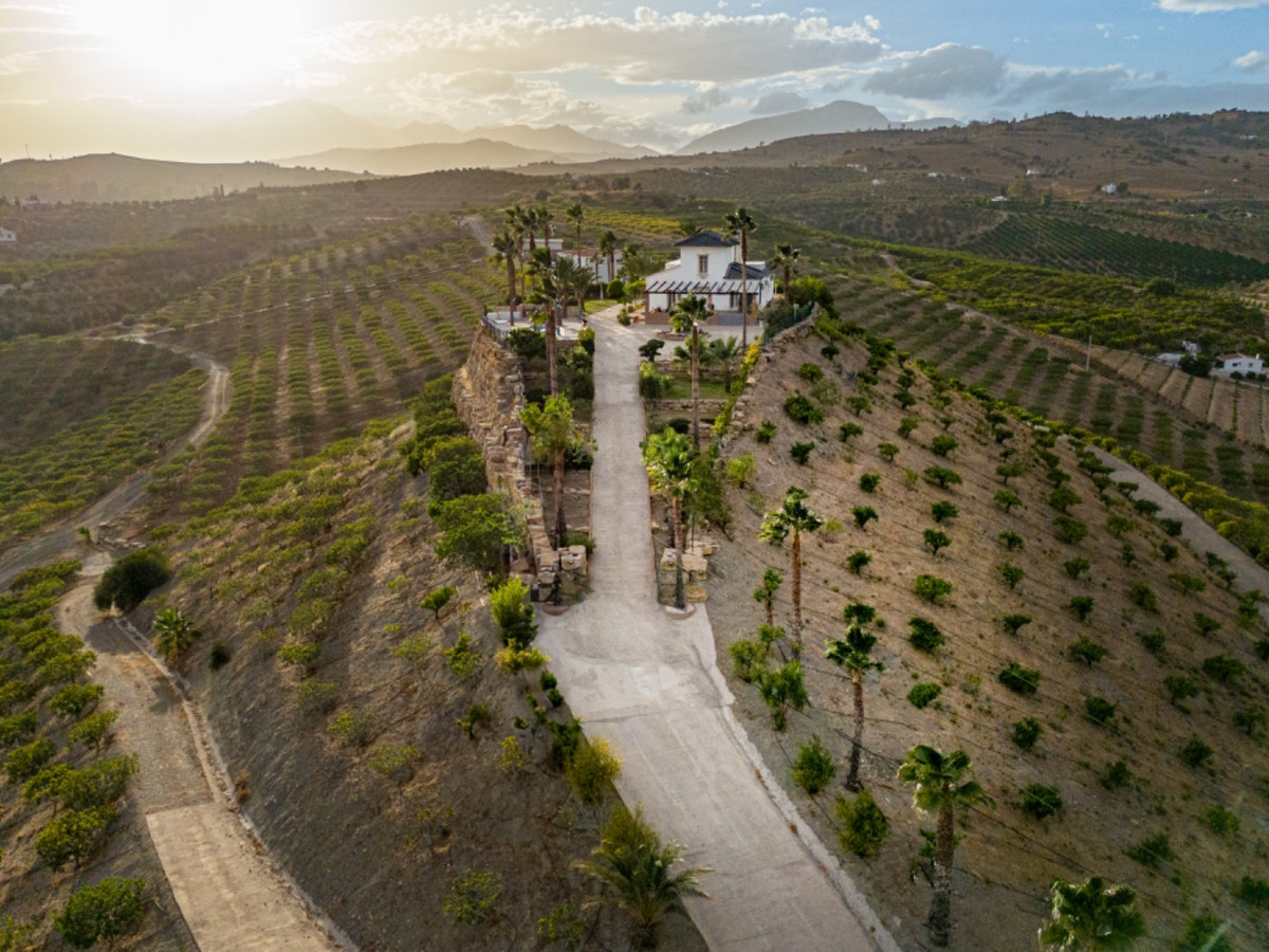 Finca Pizarra is a magnificent country estate set across 14 hectares of private land between Álora and Pizarra. The property offers sweeping mountain views, total privacy, and an elegant home surrounded by fig trees and landscaped grounds. A long private driveway leads past a beautiful swimming pool to the main house and outbuildings, creating a grand sense of arrival.