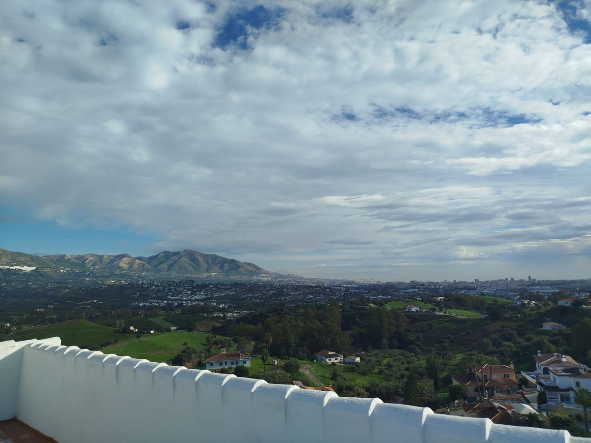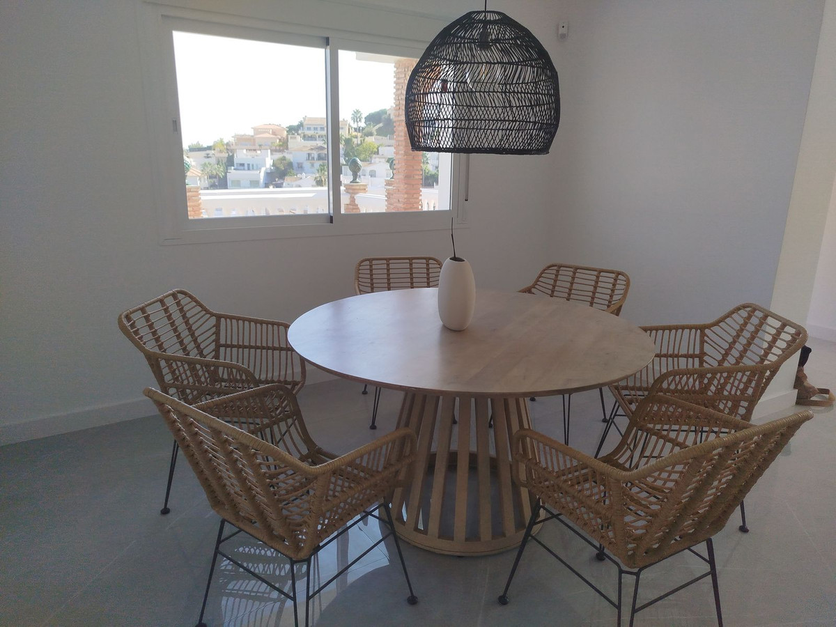 This immaculate 3-bedroom villa with 3 ensuite bathrooms has recently been totally renovated to a high standard. It is set in an elevated position in Cerros de Aguila with unparalled panoramic sea and mountain views. You enter via a long driveway with private parking plus a covered garage for 2 cars and with a good-sized storeroom. There is a gated entrance to the one level villa with an open plan living/dining room and kitchen diner both with access to large terraces with panoramic sea views and to the landscaped gardens with an infinity pool. There are 2 guest bedrooms with ensuites with access to the back garden and terraces, a guest toilet, and a large master bedroom with a feature bath, washbasin and toilet with panoramic views to the sea. The property has underfloor heating in most rooms with electric blinds and hot and cold air conditioning. The property is all fenced and alarmed with terraced gardens with a selection of fruit and palm trees. There is also a roof solarium with panoramic 360-degree views of the mountains and the sea. The property is within easy access to Fuengirola and Mijas, bars, restaurants, beach and the new Mijas park. You also have the well-placed community pool, gardens, sport facilities, bars and shops of the local community of Cerros de Aguila.