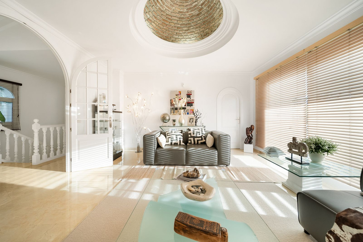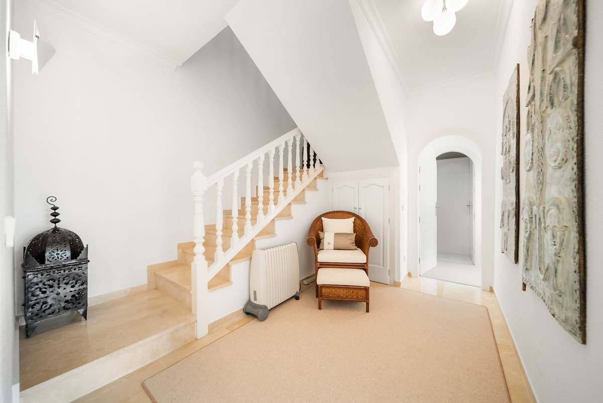 Outside, the property showcases a large frontage surrounded by greenery with a stone fountain as a centre piece, a private swimming pool with capacity of 48 m3 with an adjacent washroom / toilet, a large double garage and additional parking on the drive. There is also a large store room. With a plot size of 1,000 m² and 300 m² of constructed area, this villa is a rare find in the area. Built in 1986 and maintained in good condition, it includes fitted wardrobes, a storeroom, and modern heating and air conditioning throughout. Don't miss this opportunity to own a piece of paradise with unparalleled golf and sea views.