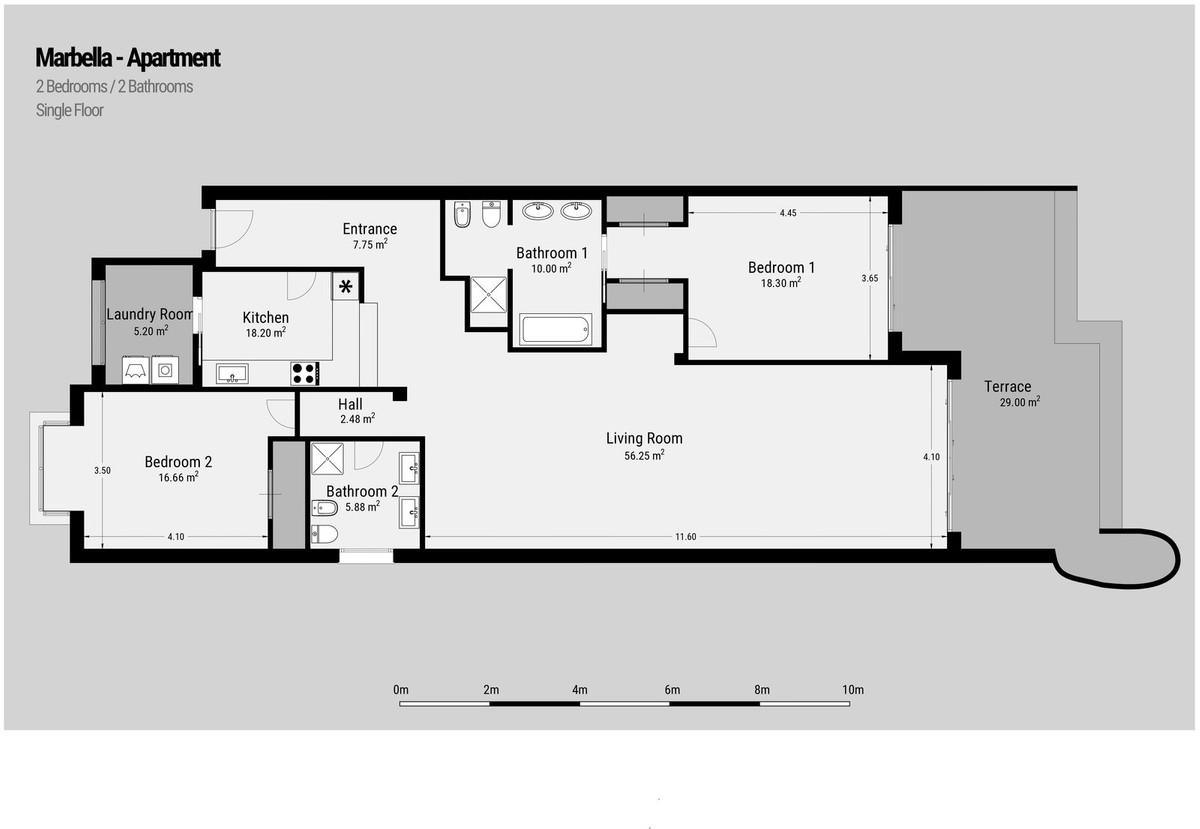This spacious and beautifully upgraded apartment features a brand-new kitchen, custom wardrobes, and a high-end A/C system. The layout includes a welcoming hallway, a large open-plan living and dining area, a fully fitted kitchen, a master bedroom with en-suite bathroom, and a guest bedroom with a private terrace and its own spacious bathroom. The highlight of the home is its expansive 41 m² south-facing terrace, glass-enclosed for year-round enjoyment. Additional luxury features include underfloor heating throughout the entire apartment.