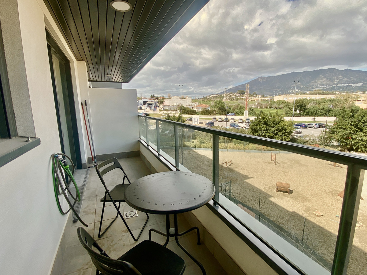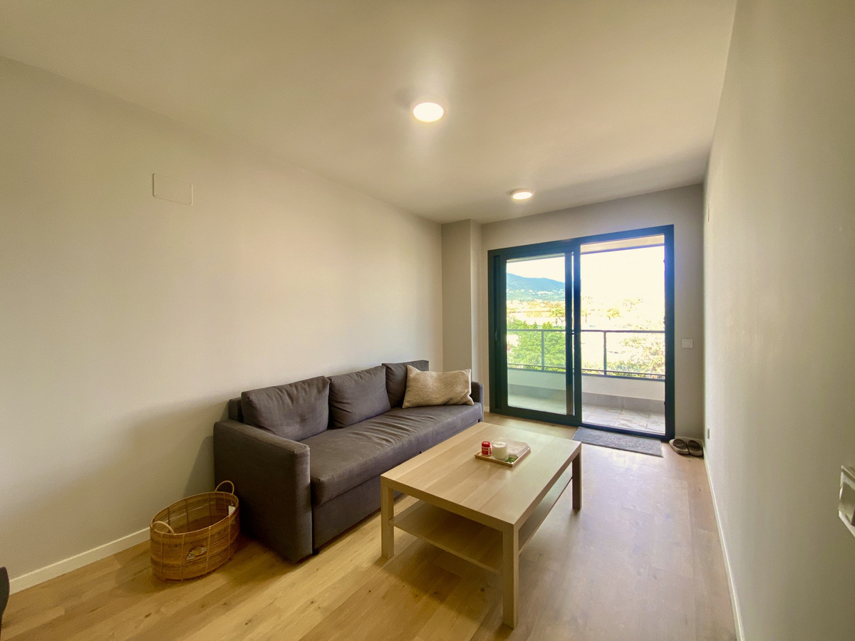 The apartment boasts three spacious bedrooms, including a master bedroom with an en-suite bathroom, and an additional family bathroom. The interiors feature an open-plan living area with wooden floors and glass doors that lead to a private terrace, perfect for enjoying the serene country and mountain views. The fully fitted kitchen is equipped with modern appliances, while fitted wardrobes and a storage room provide ample space.