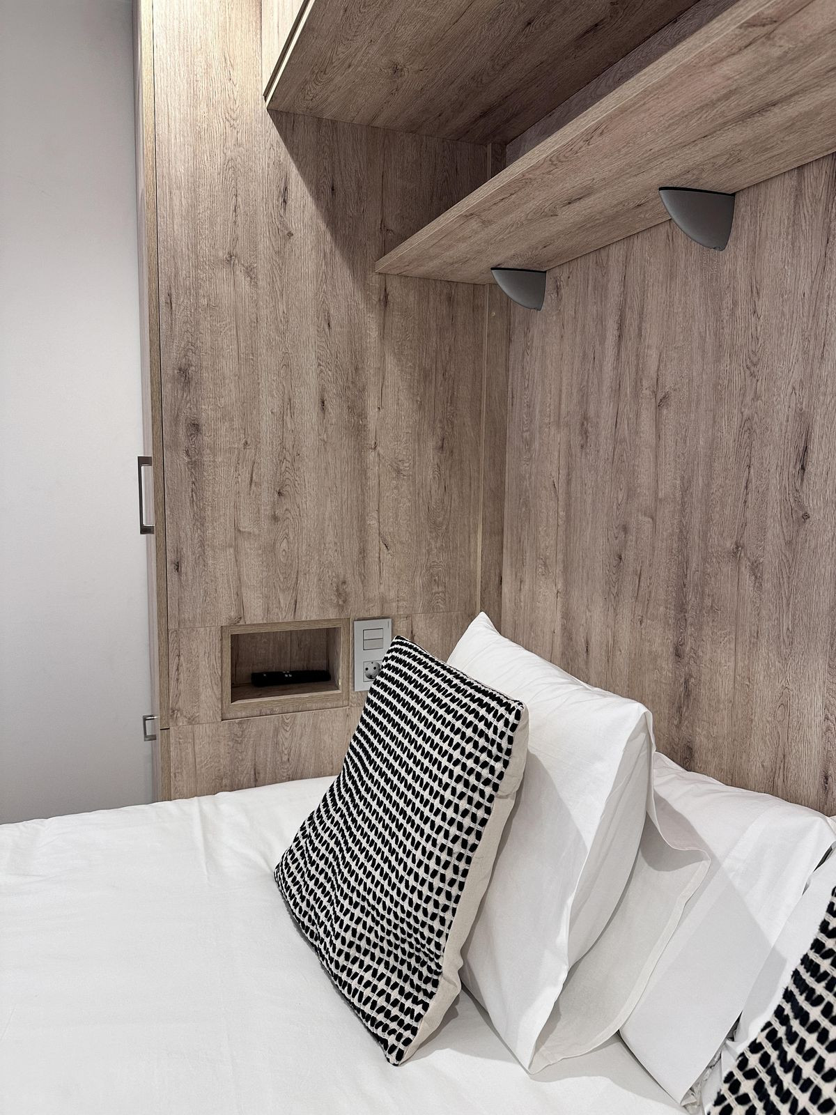 Cozy property with an elegant contemporary style, consisting of a living room with kitchen, bedroom area, and bathroom.