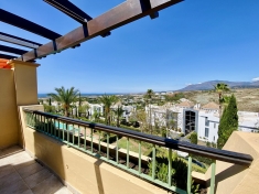 Rare opportunity to purchase a corner penthouse apartment located in the La Noria area of La Cala de Mijas so an easy walk to the town and beach. The west facing terrace has afternoon and evening sun plus owners have the option to install a staircase to access a private roof terrace if you want additional outdoor space. Bright open plan lounge diner with fully fitted kitchen and 3 double bedrooms. The main bedroom has a walk in wardrobe and a gorgeous en-suite bathroom. The guest bedrooms have the use of the additional shower room plus there is an extra guest toilet which could be made into a 3rd bathroom if required. Finished to the highest quality with hot and cold air conditioning this property also includes 2 underground parking space and a huge storeroom. Owners also use of the beautiful communal swimming pool and the upcoming spa. We have keys in the office for you to come and visit this gem of a property