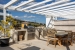 2 manually adjustable sunshades over a pergola with a large dining table