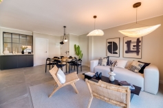 The living-dining room, large and bright, extends to the various terraces of the apartment, creating a perfect atmosphere to enjoy the Mediterranean climate. In total, the property has 3 terraces, each offering exceptional views of the meticulously maintained Mediterranean gardens, providing a unique spot for relaxation and privacy. These terraces are the ideal place to enjoy outdoor meals, reading, or simply unwind with the gentle sea breeze.