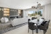The home features an open-plan layout where the kitchen, dining room, and living room flow harmoniously, creating a spacious and bright environment. The interiors have been designed to the highest quality standards, enhanced by a careful selection of contemporary furnishings. The modern kitchen is equipped with state-of-the-art appliances and features a stunning curved island that adds functionality and style to the space.