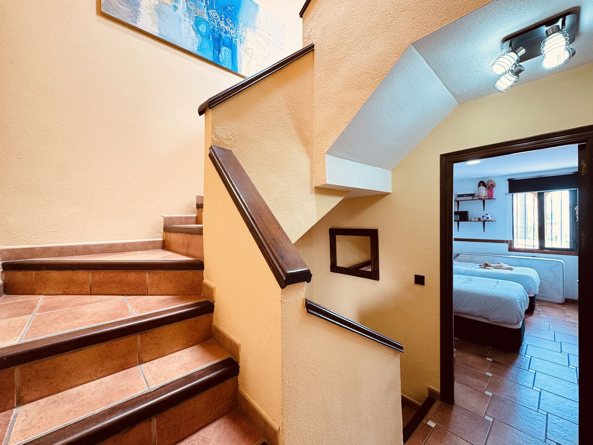 Inside, the home is filled with authentic Spanish charm. The ground floor features a spacious, fully fitted independent kitchen, and a generous open-plan living and dining area complete with a cozy fireplace. From here, step out onto the southeast-facing covered terrace, which enjoys direct access to the beautifully maintained communal gardens and swimming pool—perfect for relaxing or entertaining.
