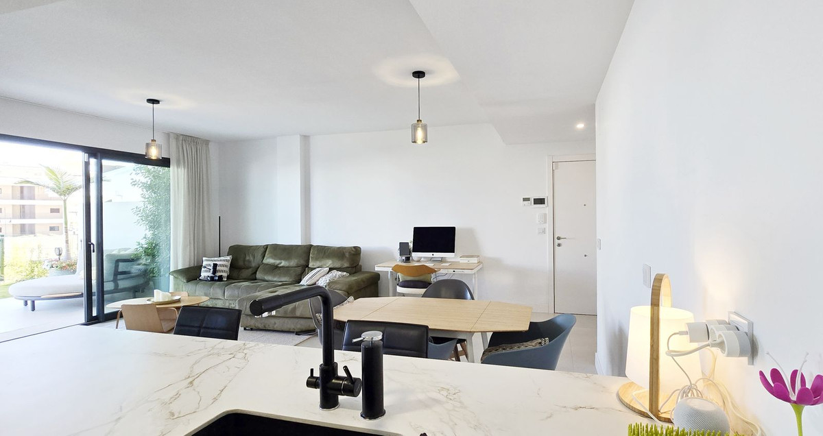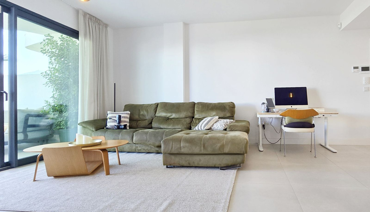 The bright living room with open-plan kitchen connects to the terrace and barbecue area – ideal for enjoying the Mediterranean climate all year round. The kitchen also features a large window with direct access to the terrace, bringing in plenty of natural light.