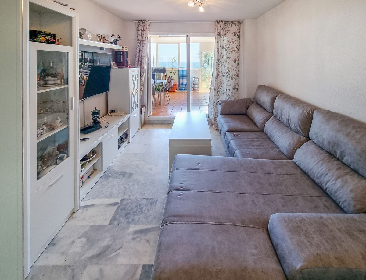The living room is bright and leads to a covered large terrace with stunning sea views, that is currently used as sun room, but could be transformed into a second living space or even an office.