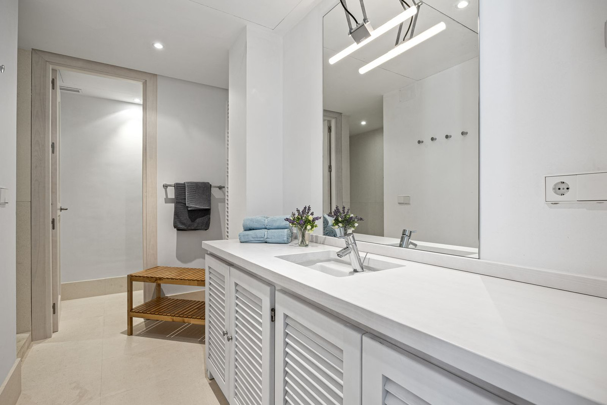 With nearly 700m2 of south-facing interior space, the home is thoughtfully designed for relaxed living and entertaining. Five en-suite bedrooms, expandable to six, are complemented by bright open-plan living areas, a home cinema, and a games room. Outdoor spaces feature a poolside bar, barbecue area, and expansive terraces for year-round enjoyment. The architecture reflects classic andalusian style, with a romantic central patio, whitewashed walls, blue shutters, and a layout that balances family comfort with refined hosting areas.