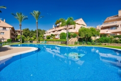 Within a pleasant residential complex where the apartments are distributed across 8 small blocks of three levels, this penthouse offers a spacious living room, a fully fitted kitchen with separate utility room, 3 bedrooms (one en-suite with its own bathroom and access to the terrace), a second full bathroom, and a beautiful large terrace of 47m² leading up to a 128m² solarium with pergola and jacuzzi, boasting breathtaking views of the golf course, the mountains, and the sea.