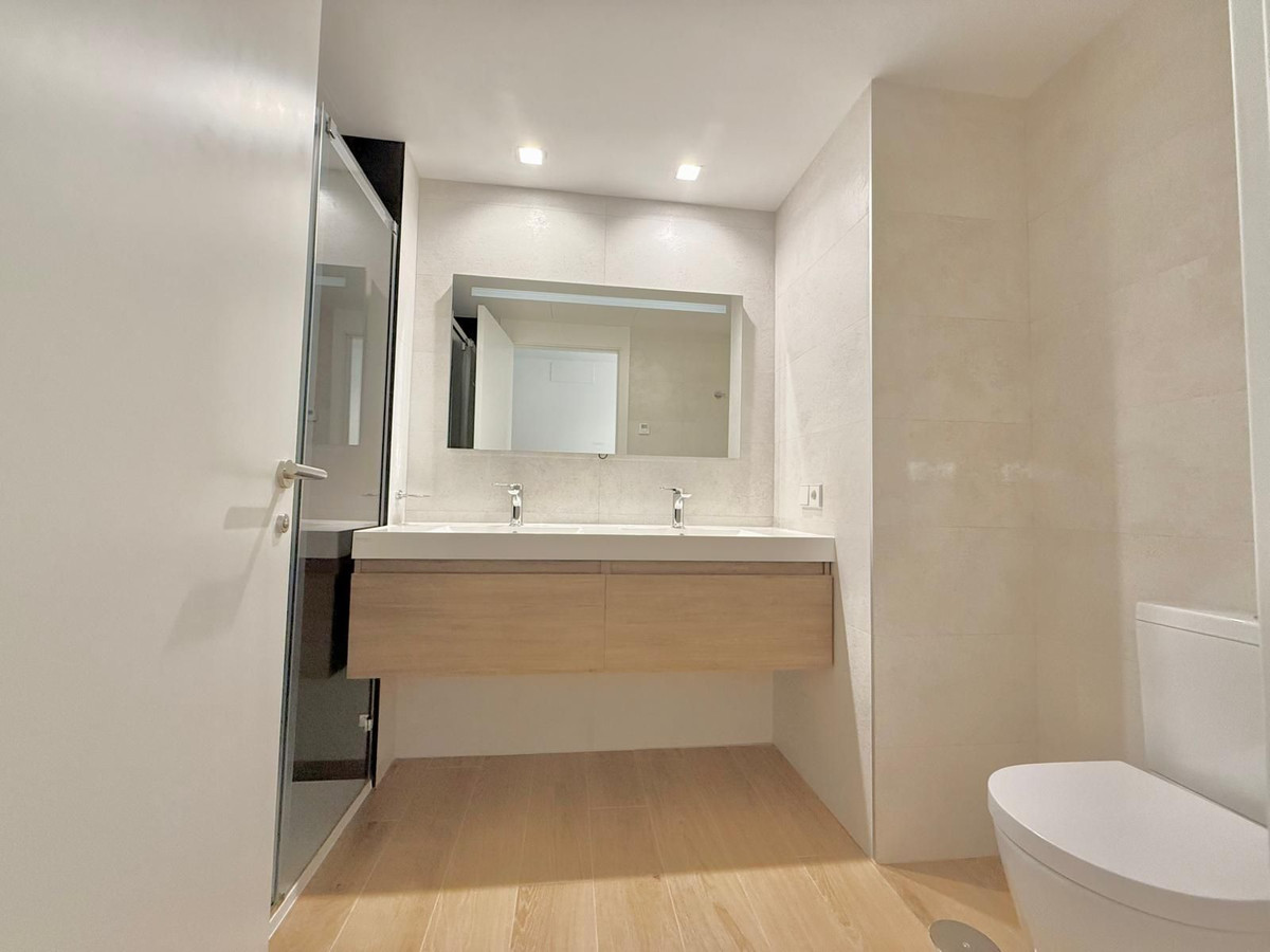 The bright and expansive living-dining area opens onto one of the two private terraces, perfect for enjoying the Mediterranean climate year-round. The apartment includes three bedrooms: the master suite features a walk-in wardrobe and en-suite bathroom, while the other two bedrooms have access to the rear terrace and come with fully fitted built-in wardrobes. There is also a second large, modern bathroom.