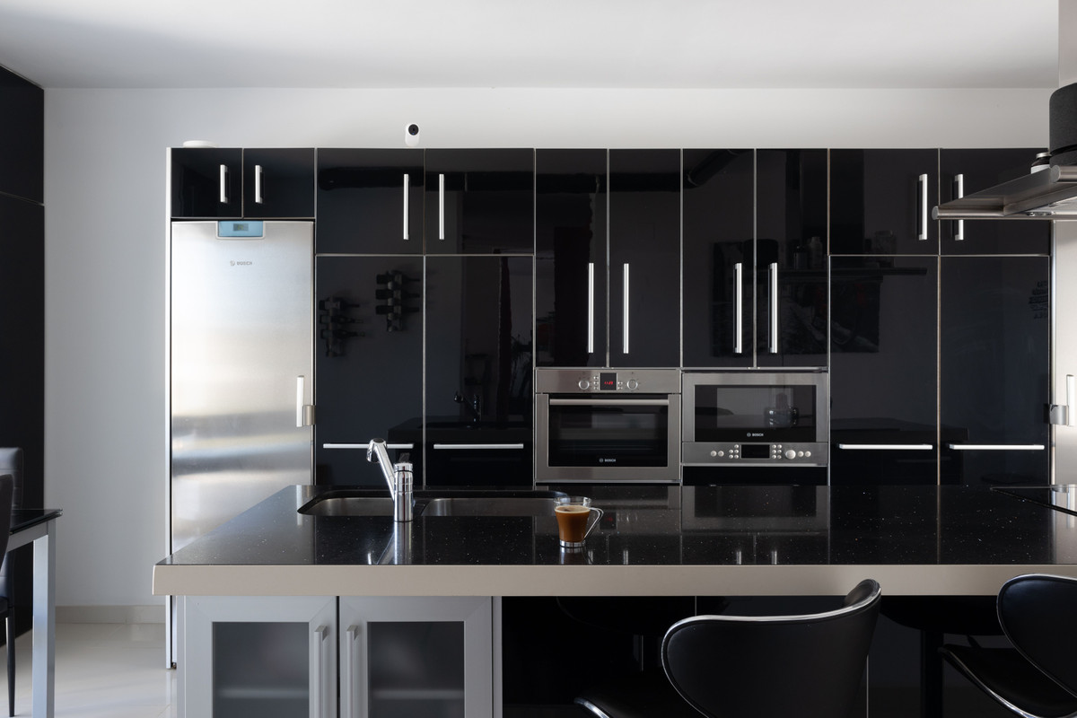 A fully fitted, high-end kitchen filled with natural light