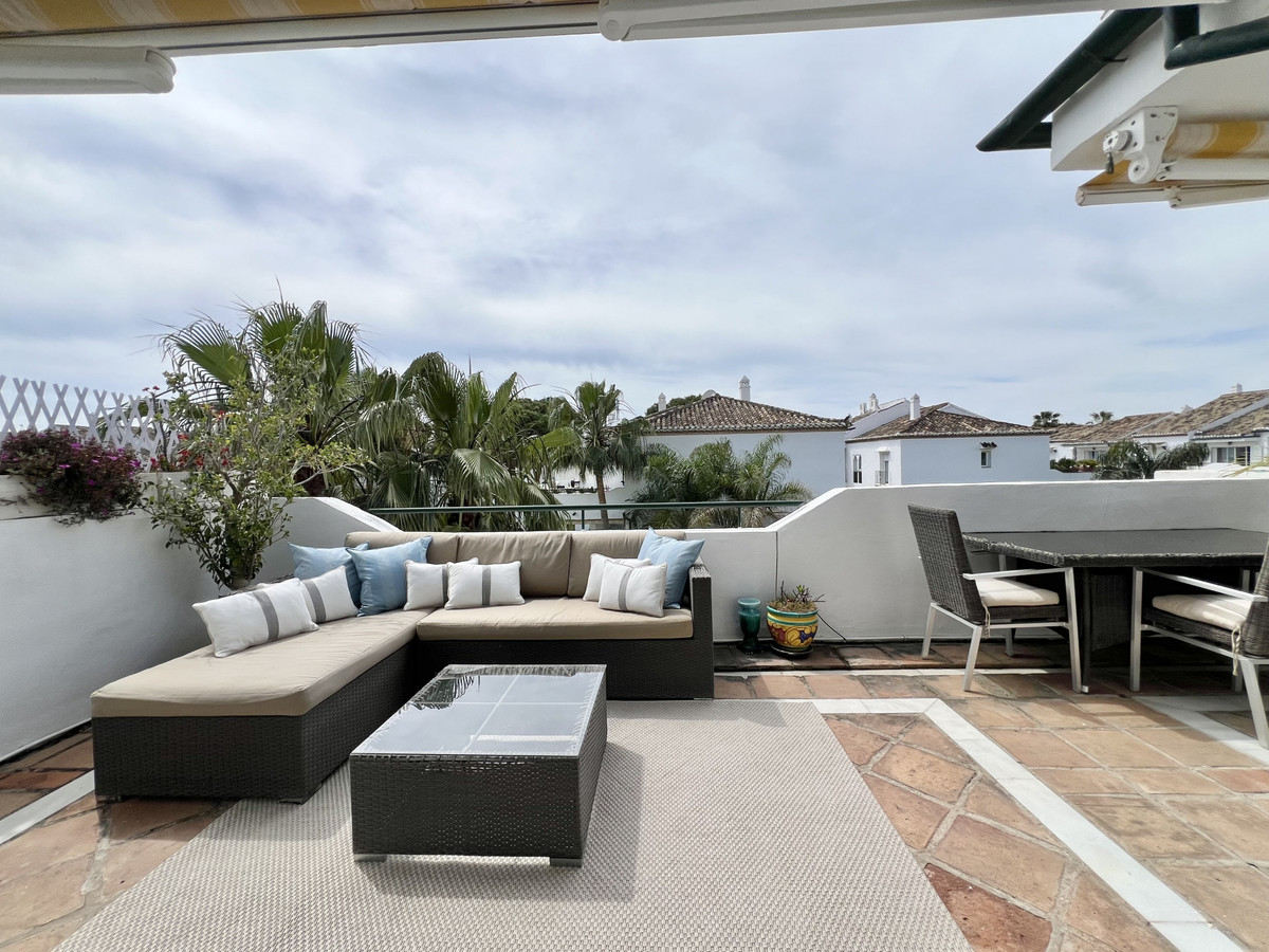 Fantastic top-floor apartment, south-facing, in El Presidente. The beautiful entrance, filled with aromatic plants, welcomes us, and as soon as we enter the hall, we appreciate how the entire apartment is bathed in sunlight. The spacious living and dining room, with large sliding glass doors, opens onto the very sunny terrace. The master bedroom also has direct access to the same terrace and features an en-suite bathroom. The second bedroom overlooks a charming pine forest. The second bathroom also serves as a guest toilet. The kitchen is fully equipped. El Presidente offers a large parking area, five swimming pools, one of them heated all year around, wonderful mature communal gardens with fountains, tennis and paddle courts, and 24-hour security. Amenities, supermarkets, and restaurants are within walking distance, as well as the beach, the new Estepona coastal path, and excellent restaurants such as Salduna, just 250 meters from the development. Do not miss the opportunity to visit this great opportunity!