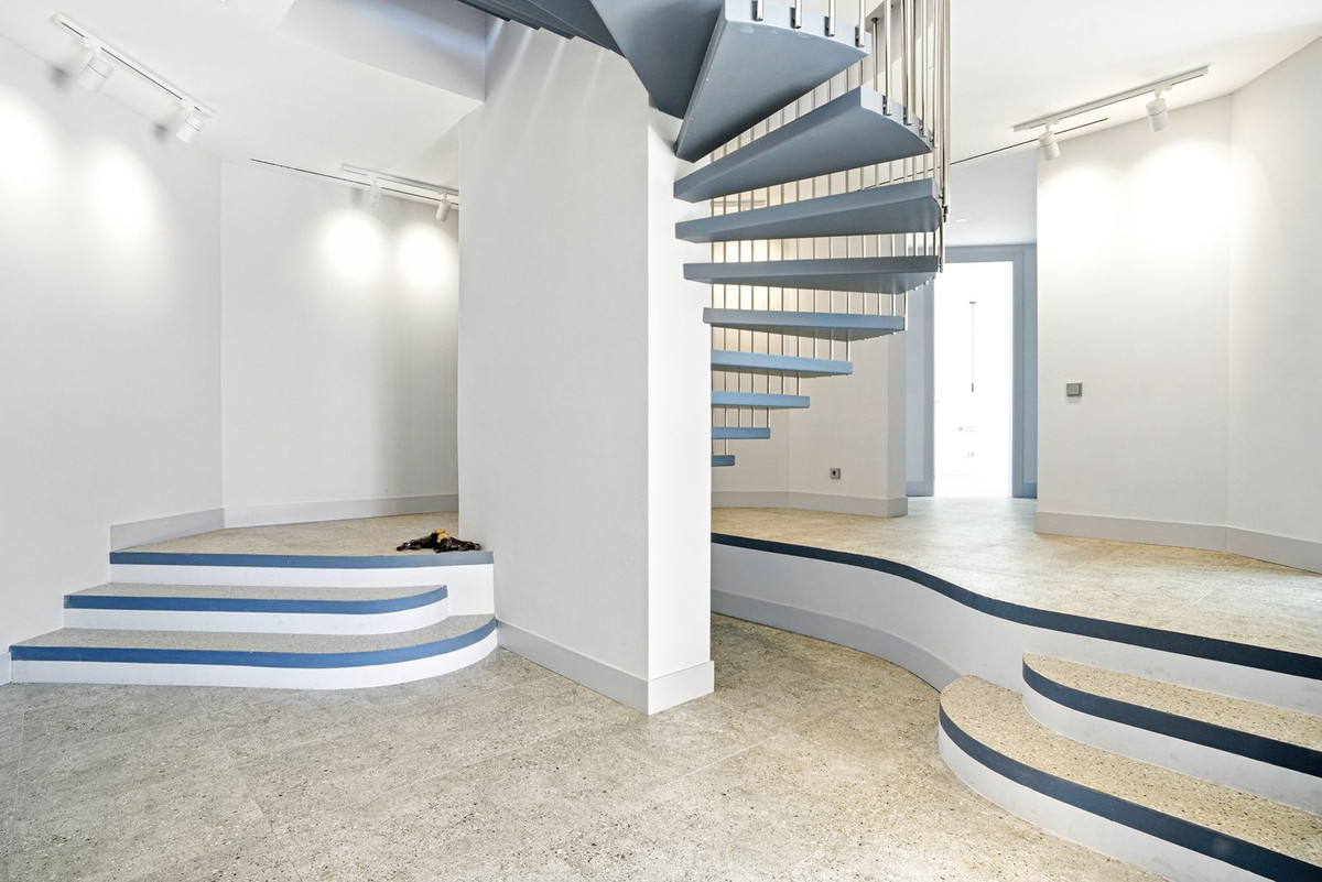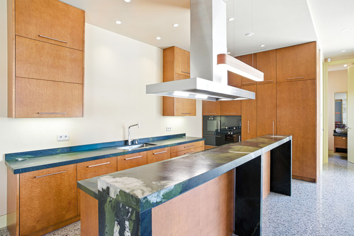 Access to the superior level is via a unique spiral staircase or an elevator with a 4-person capacity. This level opens into a spacious open-plan living, dining, and kitchen area that leads out to a partially covered terrace, heated pool, and outdoor kitchen. The entire exterior terrace is designed as a "floating terrace," allowing rainwater to flow beneath the surface and be collected in a water reservoir for reuse in irrigation.