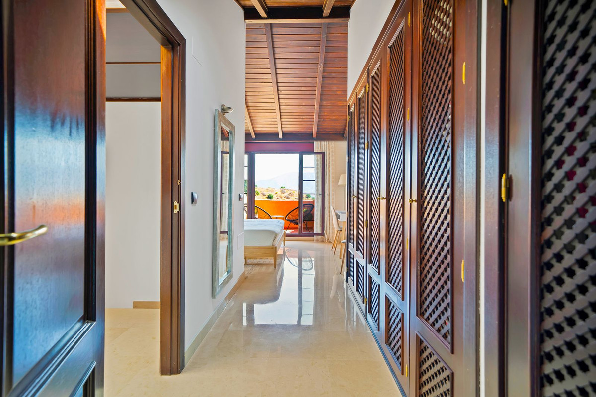 Heading through the open plan dining and living room, the double-height ceiling allows for an attractive staircase which leads to the upper level where a gorgeous master bedroom with pitched wooden roof, a generous dressing room area and a lovely high-quality bathroom with walk-in shower, large bath-tub and wash basin, and a separation between the main bathroom and the lavatory area. The pitched rooves on this level feature built in sky-light windows which bathe the rooms in daylight and give comfort of fresh air. The master bedroom benefits from privacy and also it's own gorgeous terrace that faces eastwards with awesome views of the Mijas mountains. Excellent for watching the morning sunrise.