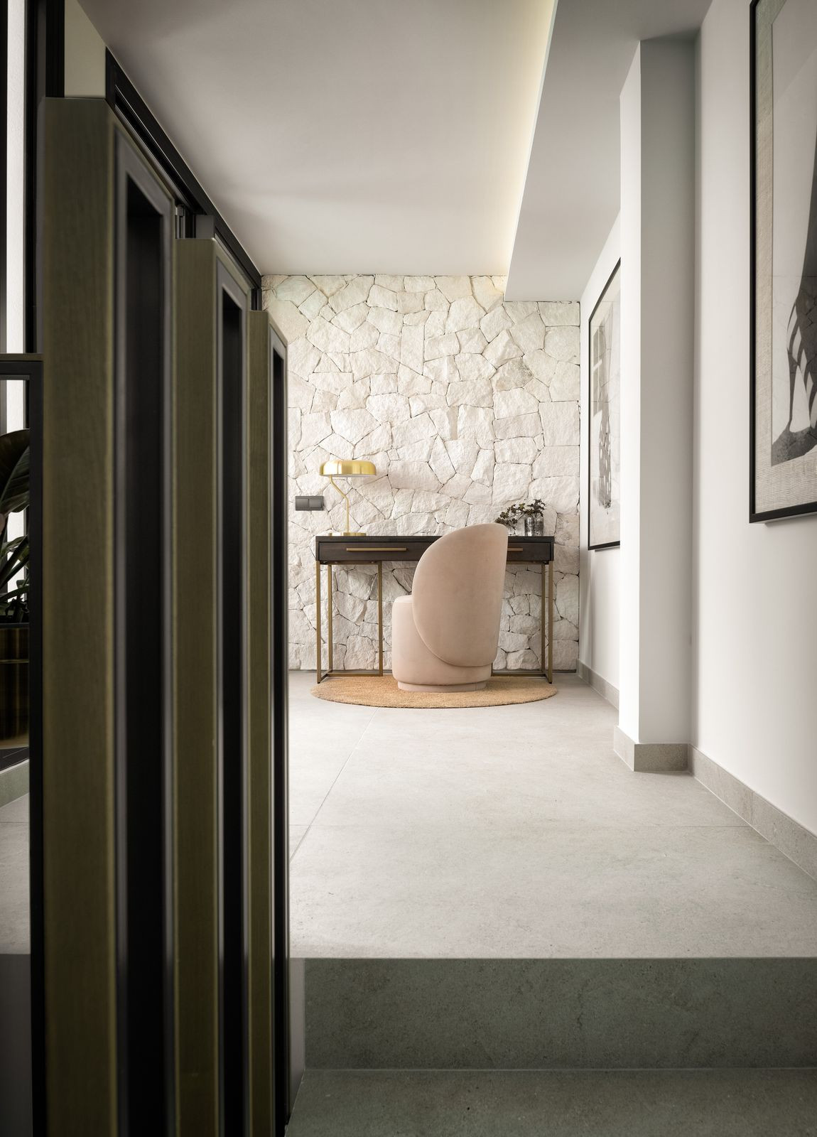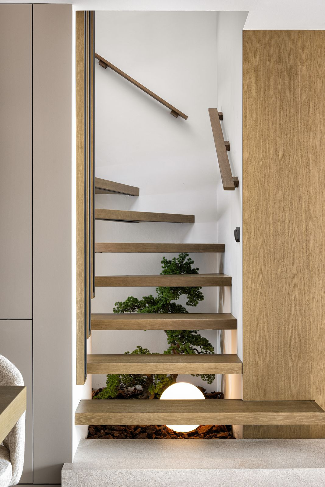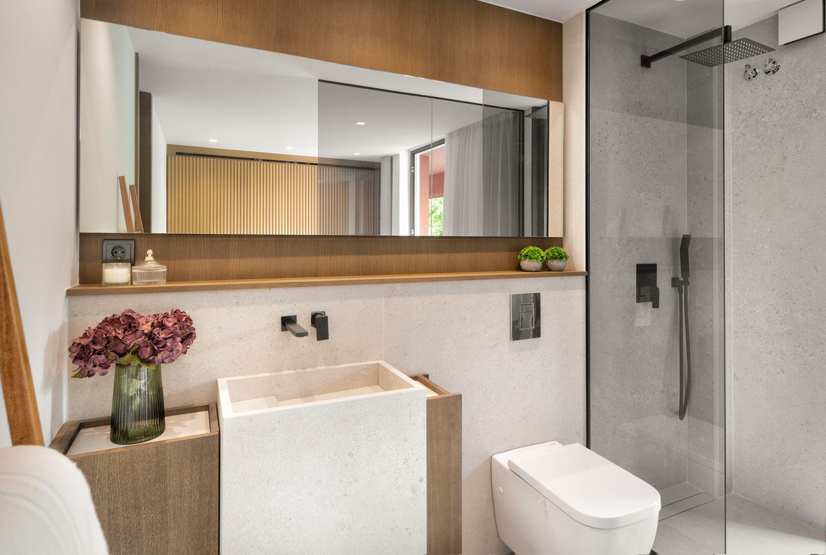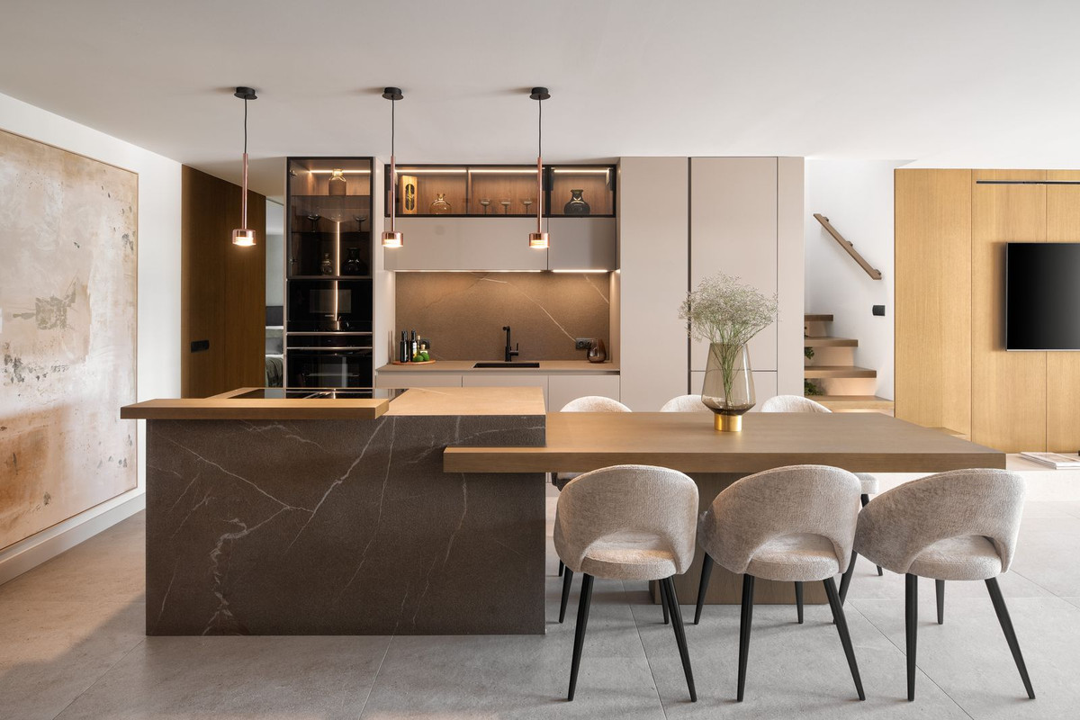Upon entering the apartment, you are welcomed by a stunning island kitchen that sets the scene for the rest of the space as it blends harmoniously into the living area and further into the terrace, giving the impression that it is a part of the living room. Enjoy the peaceful views of the green gardens from your kitchen, where sunlight pours in to fill every square inch. The choice of materials and color palette infuses this area with a sense of peace, comfort, and subtle elegance.