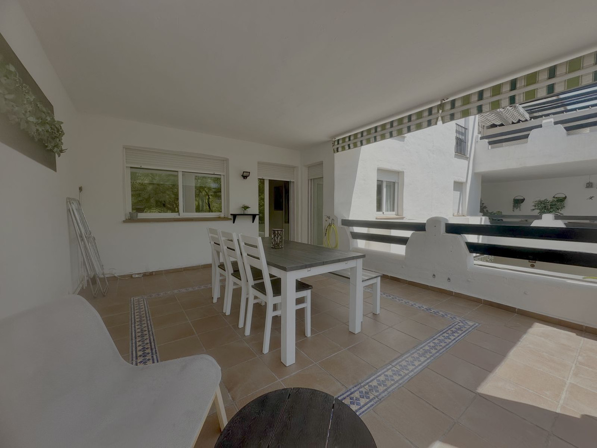 The apartment is thoughtfully laid out and comprises: an entrance hall with a built-in coat cupboard, a bright and square-shaped living-dining room with access to a spacious terrace, ideal for relaxing and soaking up the sun, a fully fitted independent kitchen, a separate utility room, two double bedrooms with fitted wardrobes, and two bathrooms. The generously sized master bedroom features direct access to the terrace, large built-in wardrobes (four-door), and an en-suite bathroom.