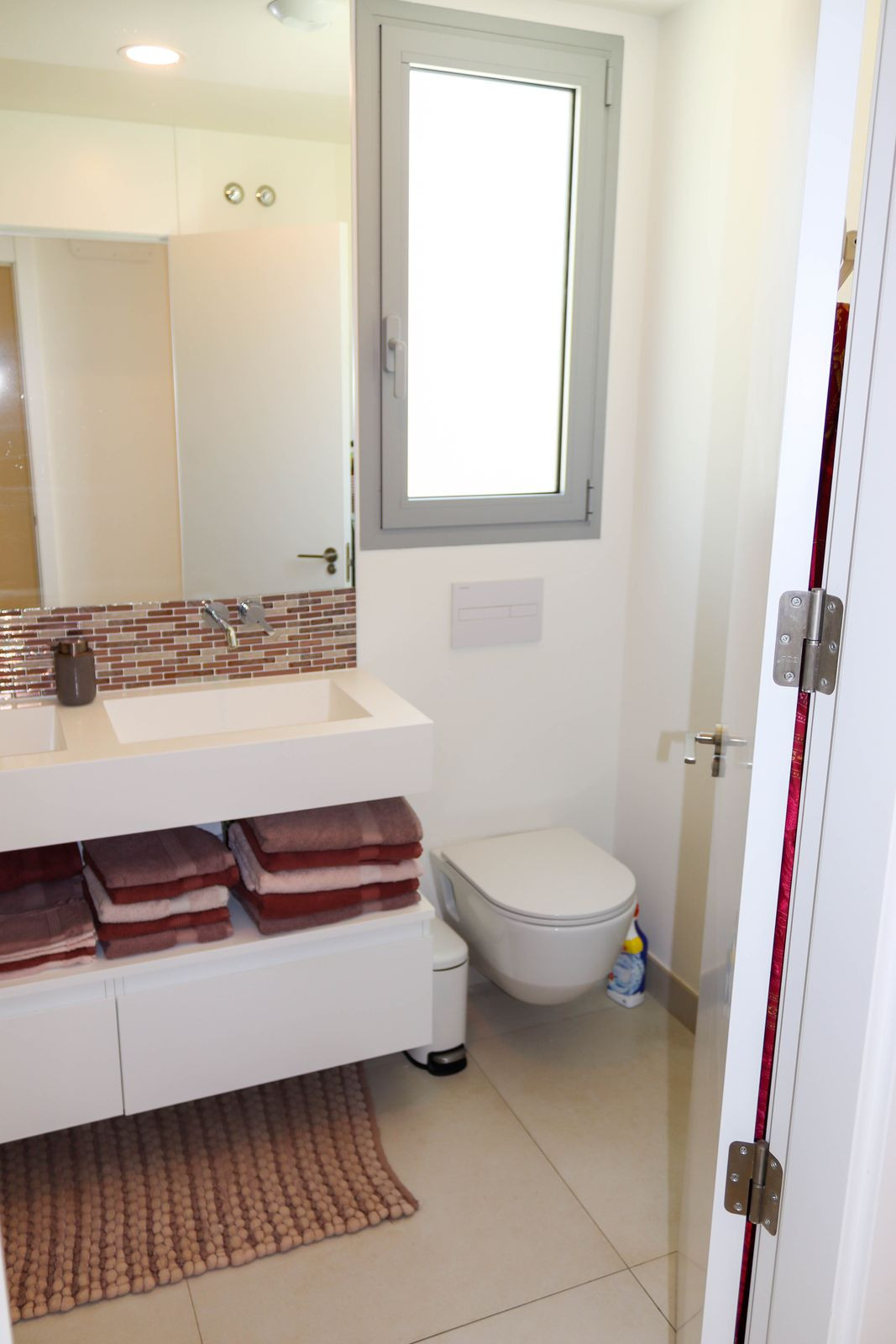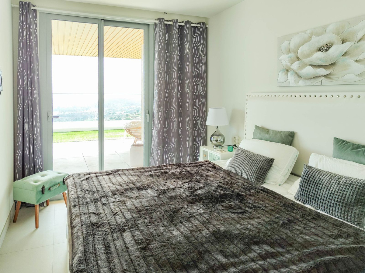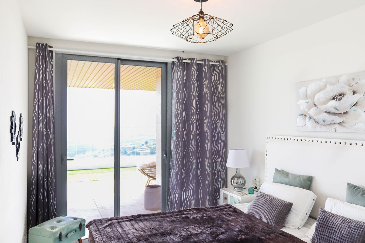The two spacious en-suite bedrooms offer a tranquil and relaxing space and are designed with great attention to detail, for example the walk-in closet in the master bedroom. The large windows let in plenty of natural light and offer panoramic views of the surroundings as well as direct access to the terrace.