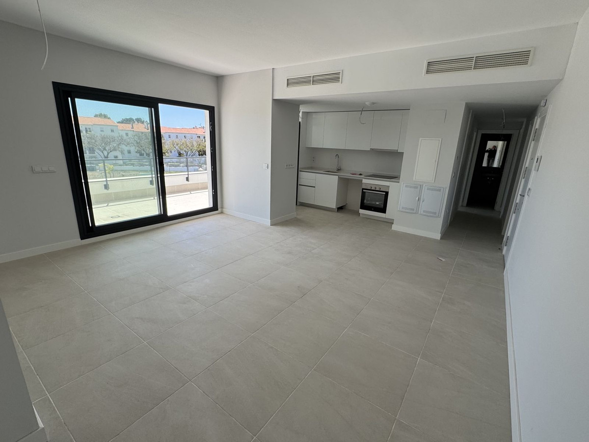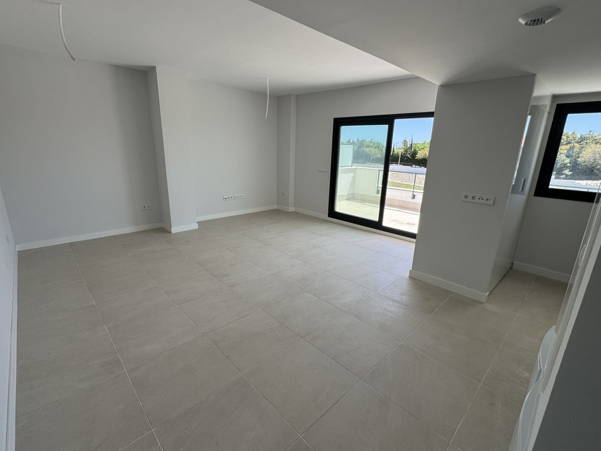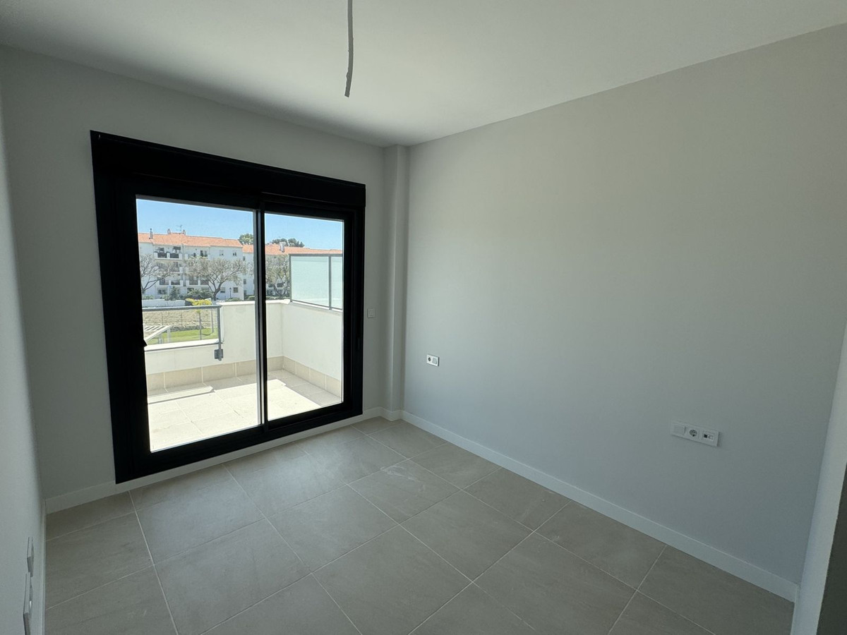 The penthouse has a modern design and offers top-quality materials and finishes. The open-plan living room with a fully equipped kitchen looks out onto a large terrace overlooking the garden and pool. The penthouse comes with a parking space and a storage room, included in the price.