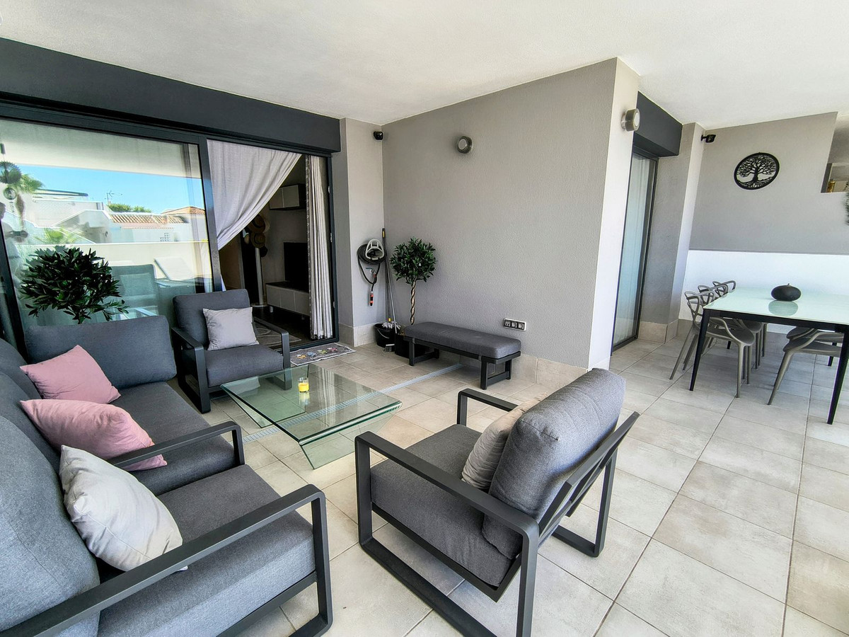 The property itself is fully equipped with an open plan kitchen/dining area which offers plenty of natural light. You also have a seperate laundry room. 2 bedrooms and 2 bathrooms with your master bedroom having it's own en suite bathroom. From your huge south facing 43m2 terrace you have stunning sea views.