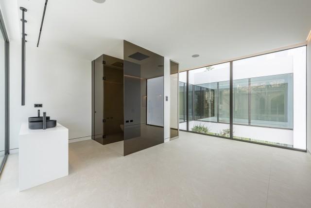 La propriété comprend quatre chambres et cinq salles de bains, dont trois luxueuses salles de bains attenantes et des toilettes invités. Trois chambres sont situées à l'étage, toutes conçues pour allier intimité et confort. La quatrième chambre, située au niveau inférieur, est idéale pour accueillir des invités, du personnel, ou pour servir de bureau ou de salle de sport. Les salles de bains sont revêtues d'un élégant marbre Porcelanosa, tandis que la maison est dotée d'un parquet en chêne chaleureux et d'une palette de couleurs neutres et apaisantes.