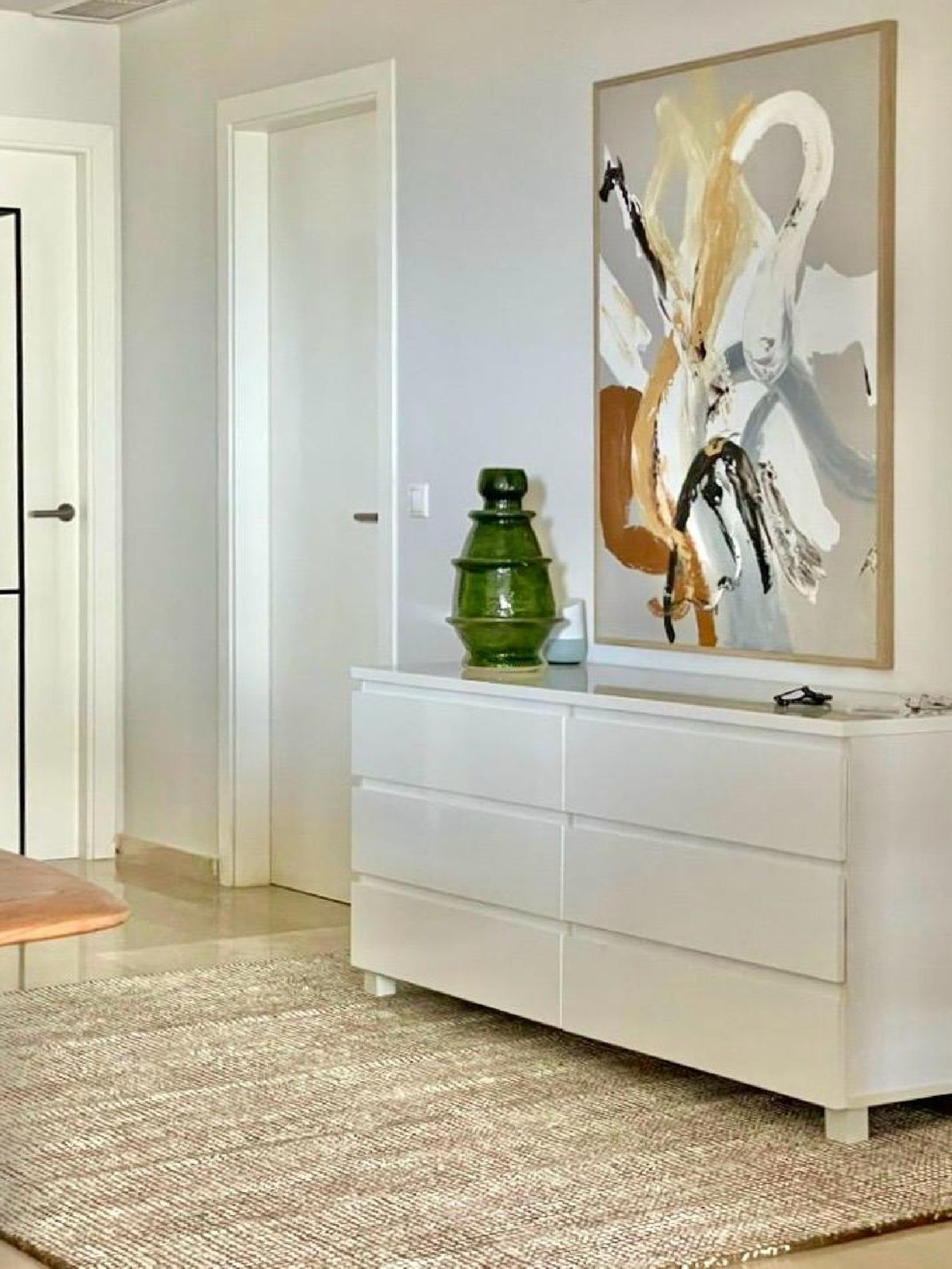 The spacious living room opens onto a southwest-facing terrace, transformed into a true additional living space thanks to the “cortinas de cristal” — frameless glass curtains. These adjustable panels allow you to enjoy the terrace year-round: fully open in summer, partially or fully closed depending on the season.