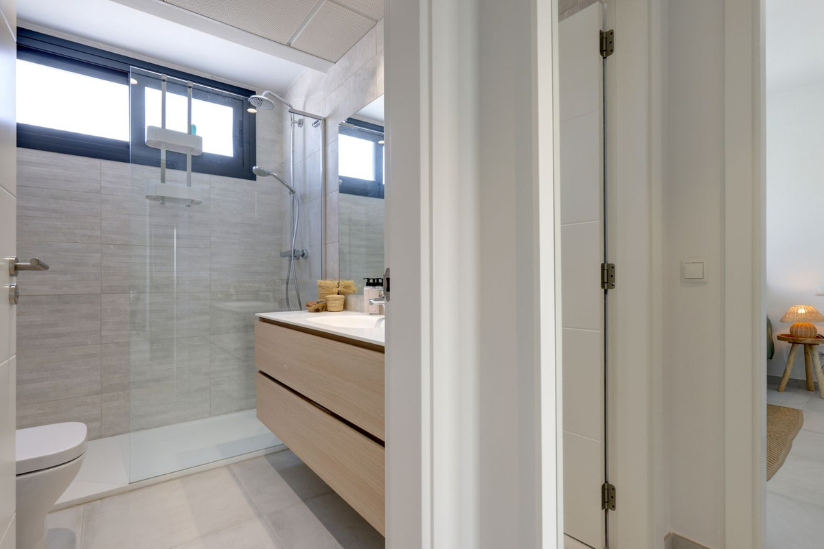 The master bedroom includes an en-suite bathroom, large built-in wardrobes, and direct access to the terrace, allowing natural light and cross ventilation. The second bedroom is also spacious and features built-in wardrobes. Both bathrooms are finished with high-quality materials and a functional yet elegant design.