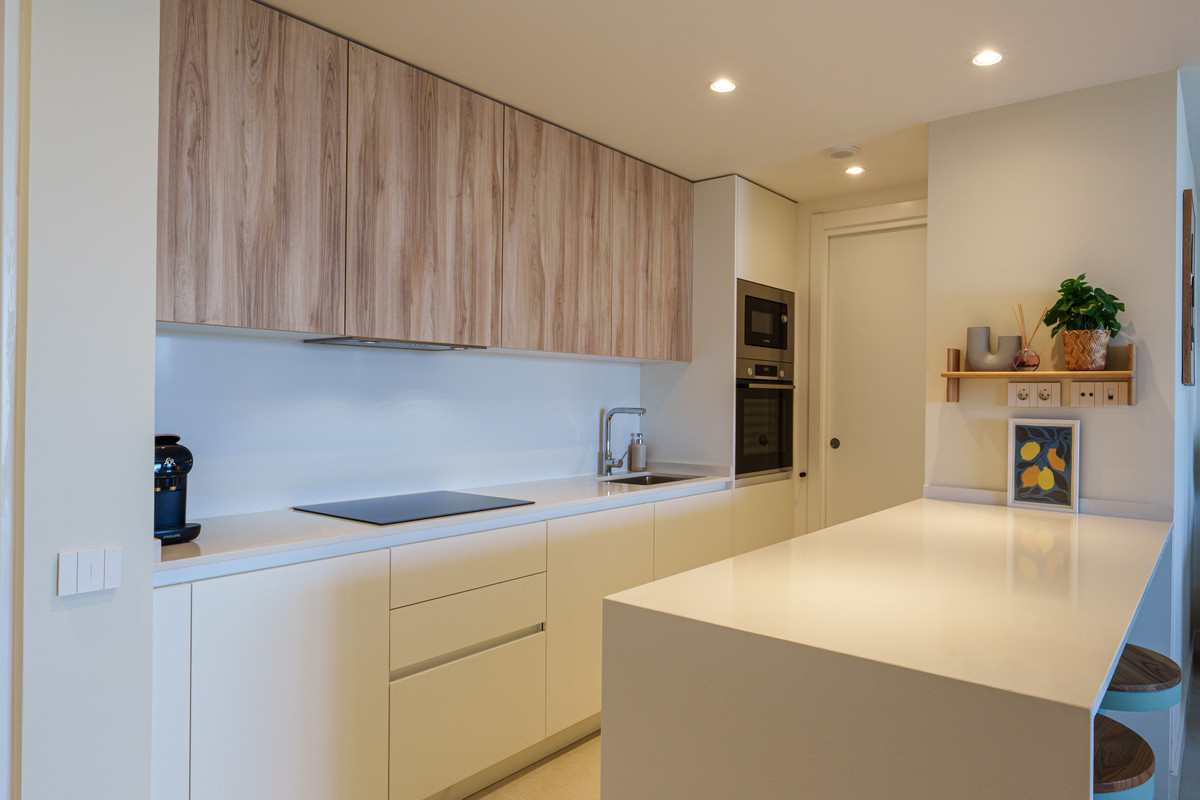 The modern kitchen, open to the living area, is fully equipped with high-quality appliances and ample storage, making it a functional yet stylish space for cooking and entertaining.