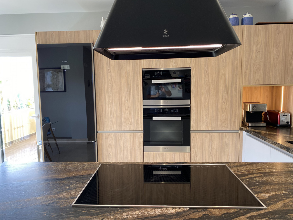 The apartment features three spacious bedrooms and two modern bathrooms, making it ideal for families or those seeking a refined retreat. The open-plan kitchen is fully fitted and equipped with premium appliances, seamlessly blending into the elegant living space. The property comes fully furnished, with fitted wardrobes and tasteful decor that complements its contemporary design. Additional conveniences include a laundry room, storage room, and a ceiling cooling system powered by advanced aerothermics technology.