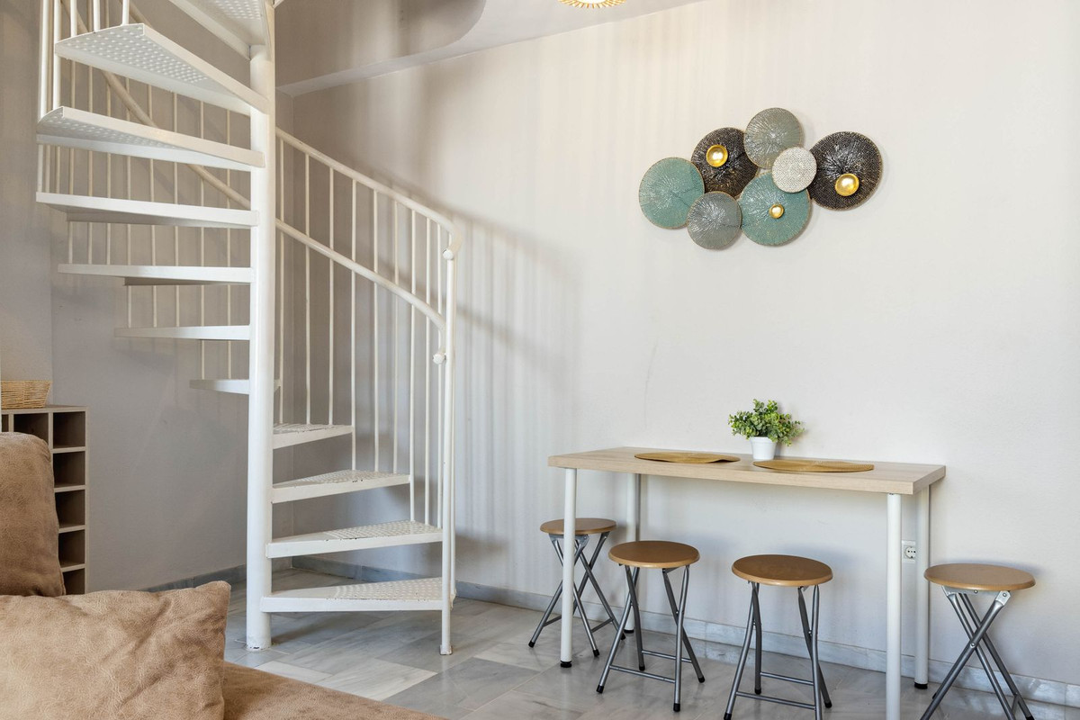 The apartment welcomes us with an entrance hall-corridor on the first floor, which serves as the distribution hub. As we walk down the corridor, we find a guest toilet, two bedrooms facing an interior patio, a full bathroom with a bathtub, and an open-plan living room and kitchen with large windows that open onto a beautiful terrace with sea views and great height, since it's a penthouse. The third bedroom is the master bedroom, located upstairs, featuring an en-suite bathroom and a terrace with sea views. The bedrooms are equipped with built-in wardrobes.
