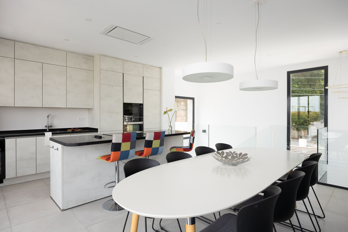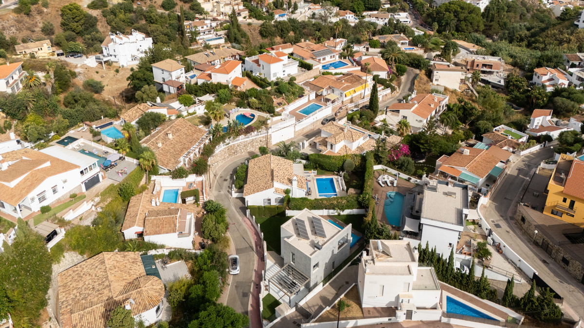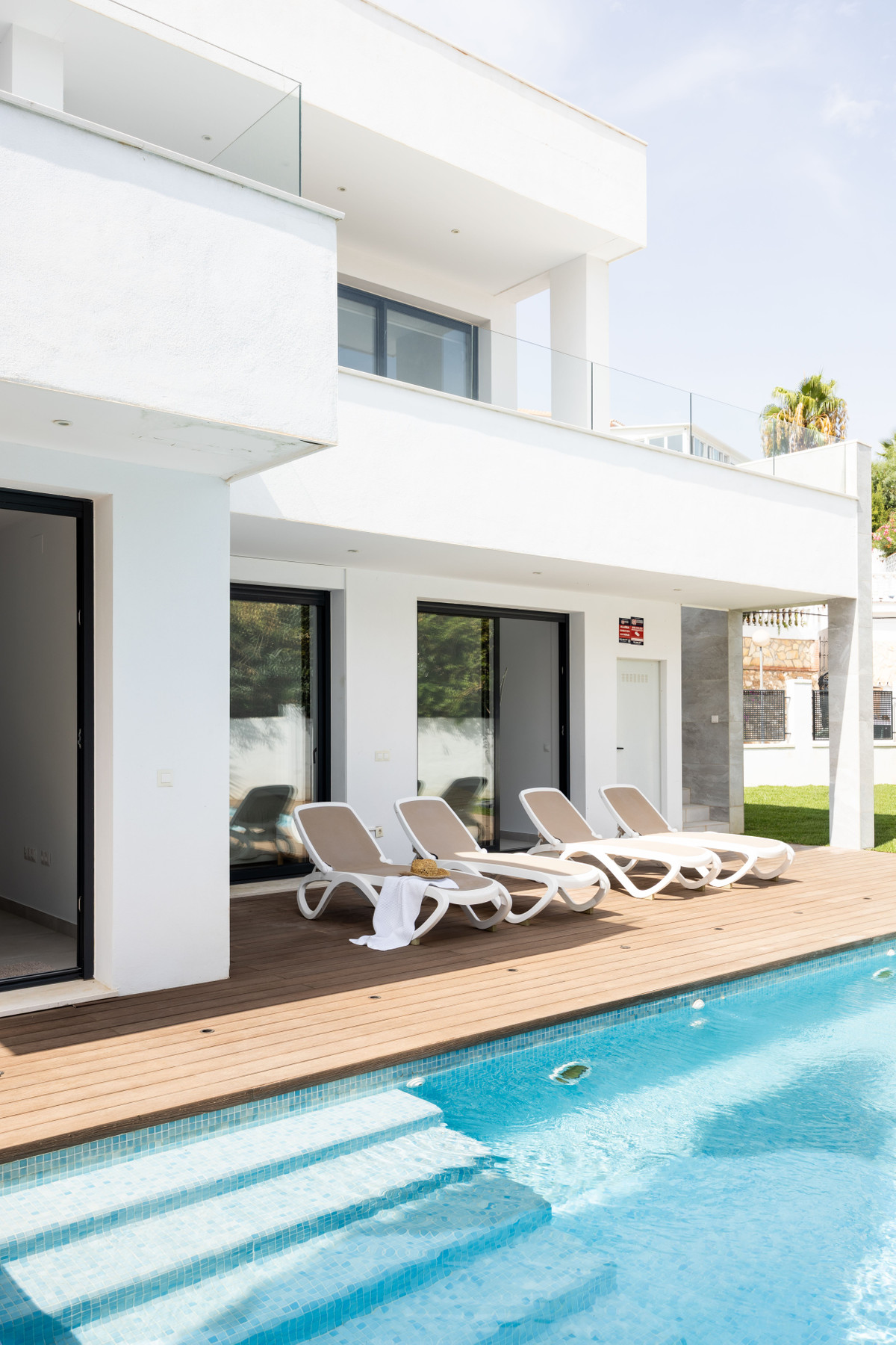 On the ground floor, you will find three spacious bedrooms, all with direct access to the terrace and pool area. The master bedroom features a luxurious en-suite bathroom and a generous walk-in closet. The upper floor impresses with an open-plan design, a state-of-the-art kitchen of the highest standard, and a bright living room. From here, you can access the large terrace, perfect for social gatherings with a dining area, lounge space, and barbecue, as well as partial sea views.