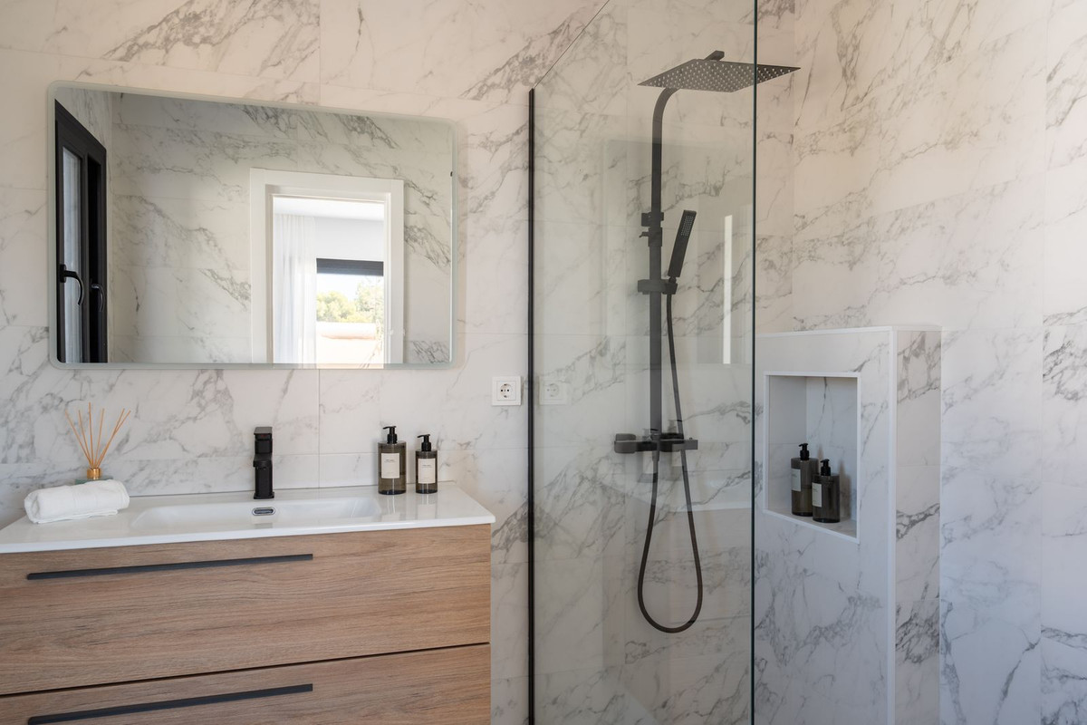 With its southwest orientation, the villa is bathed in natural light throughout the day, creating a warm and inviting atmosphere both indoors and out. From the partially elevated position, you can enjoy serene and partial views of the sea while still being just a short stroll from a wide selection of restaurants, cafés, and supermarkets.