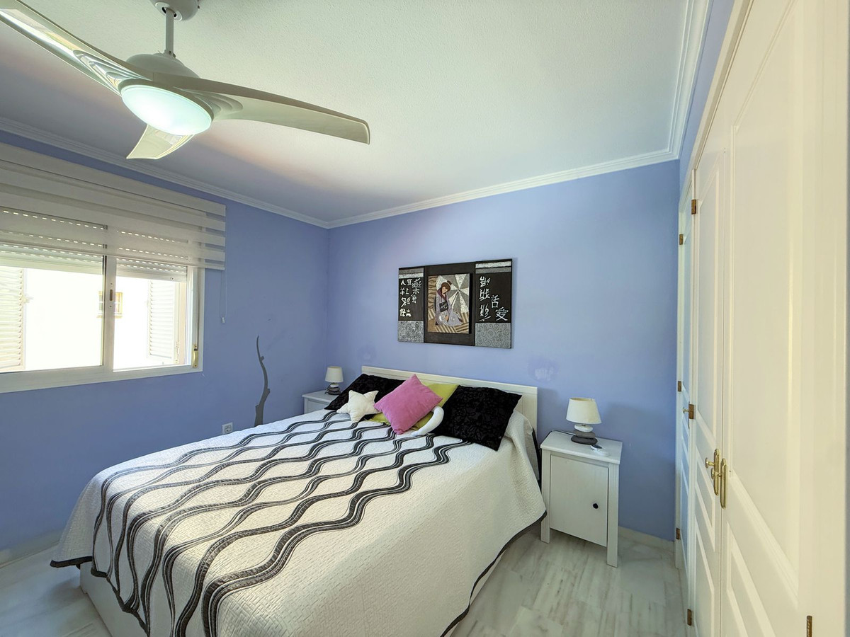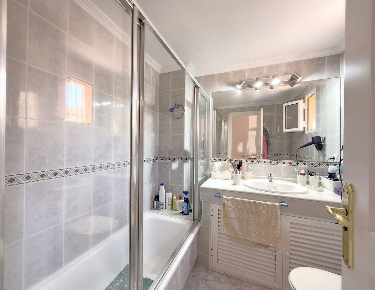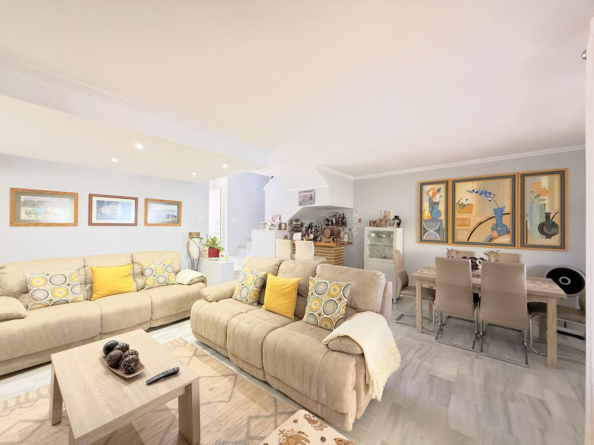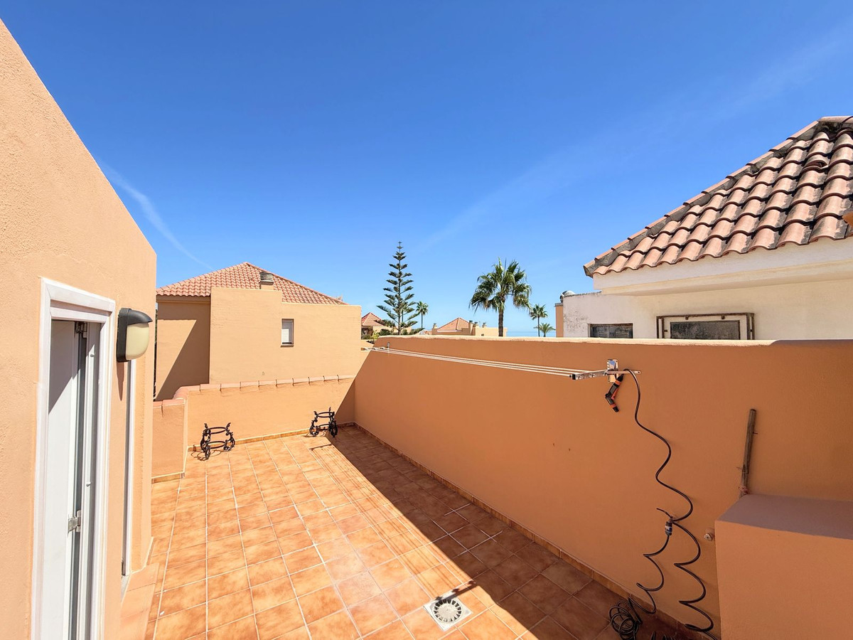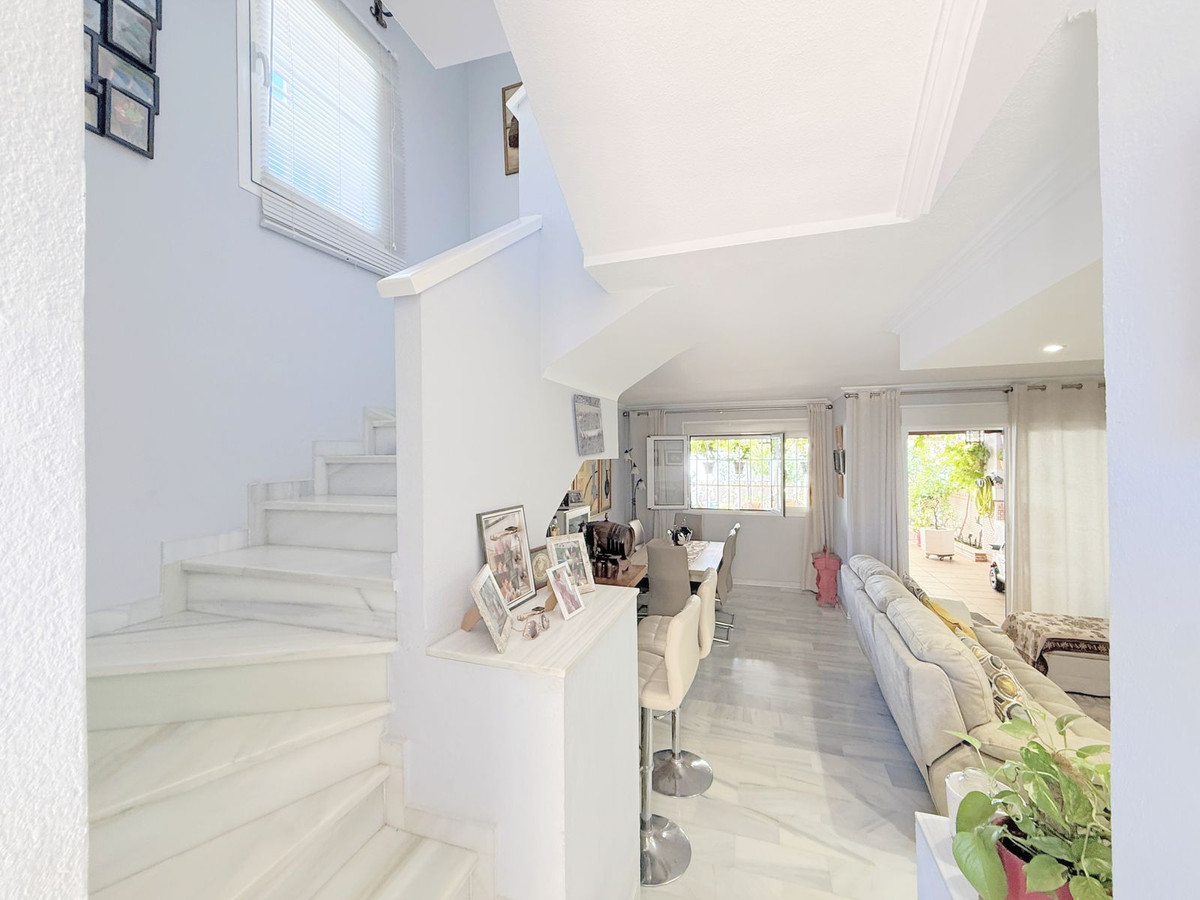 The property is distributed over two floors plus a spacious rooftop solarium with stunning sea views. It offers 3 bright and spacious bedrooms, a cozy living room, and a delightful Andalusian-style patio with fruit trees and direct access to the communal swimming pool and beautifully maintained gardens.