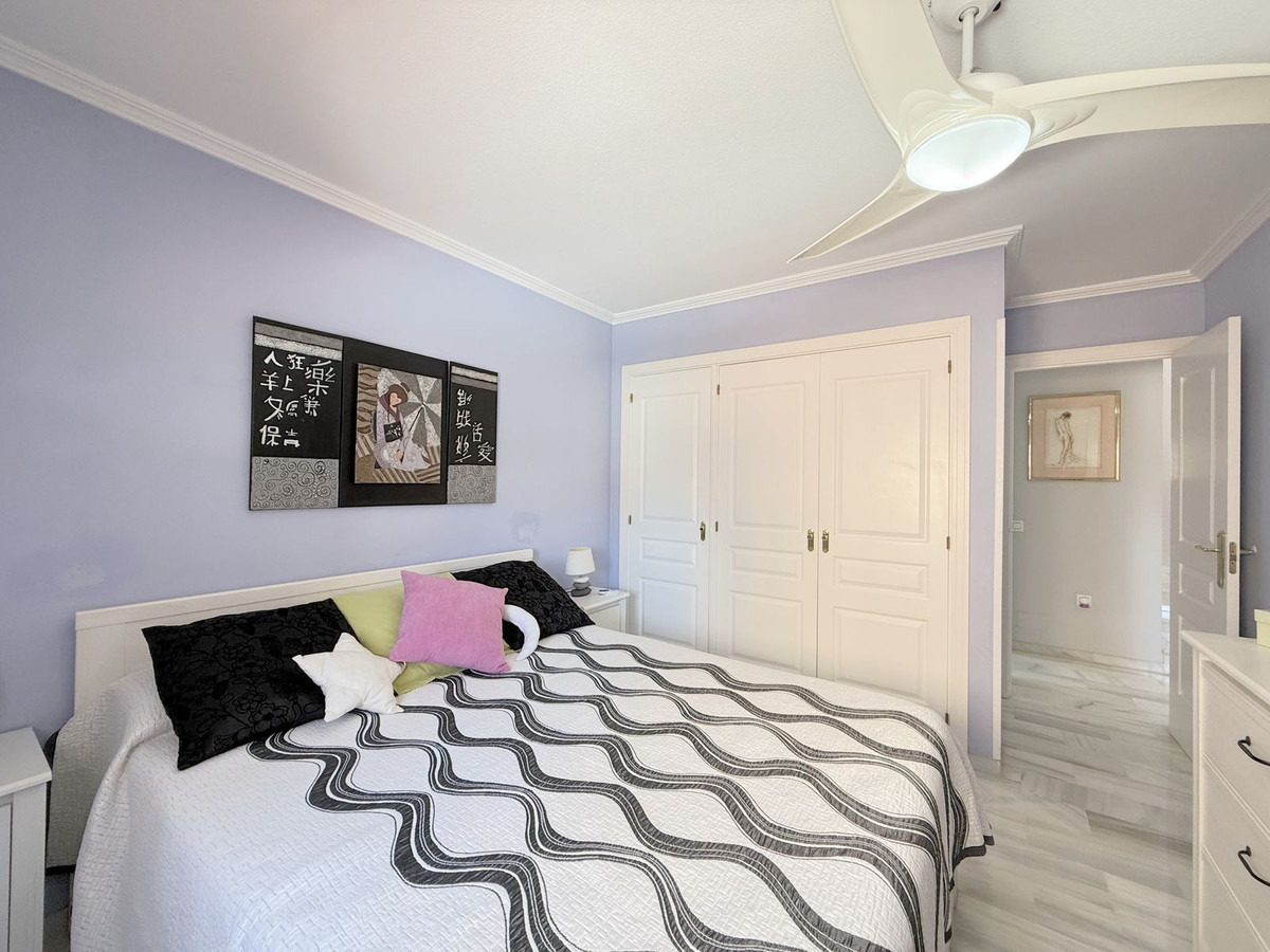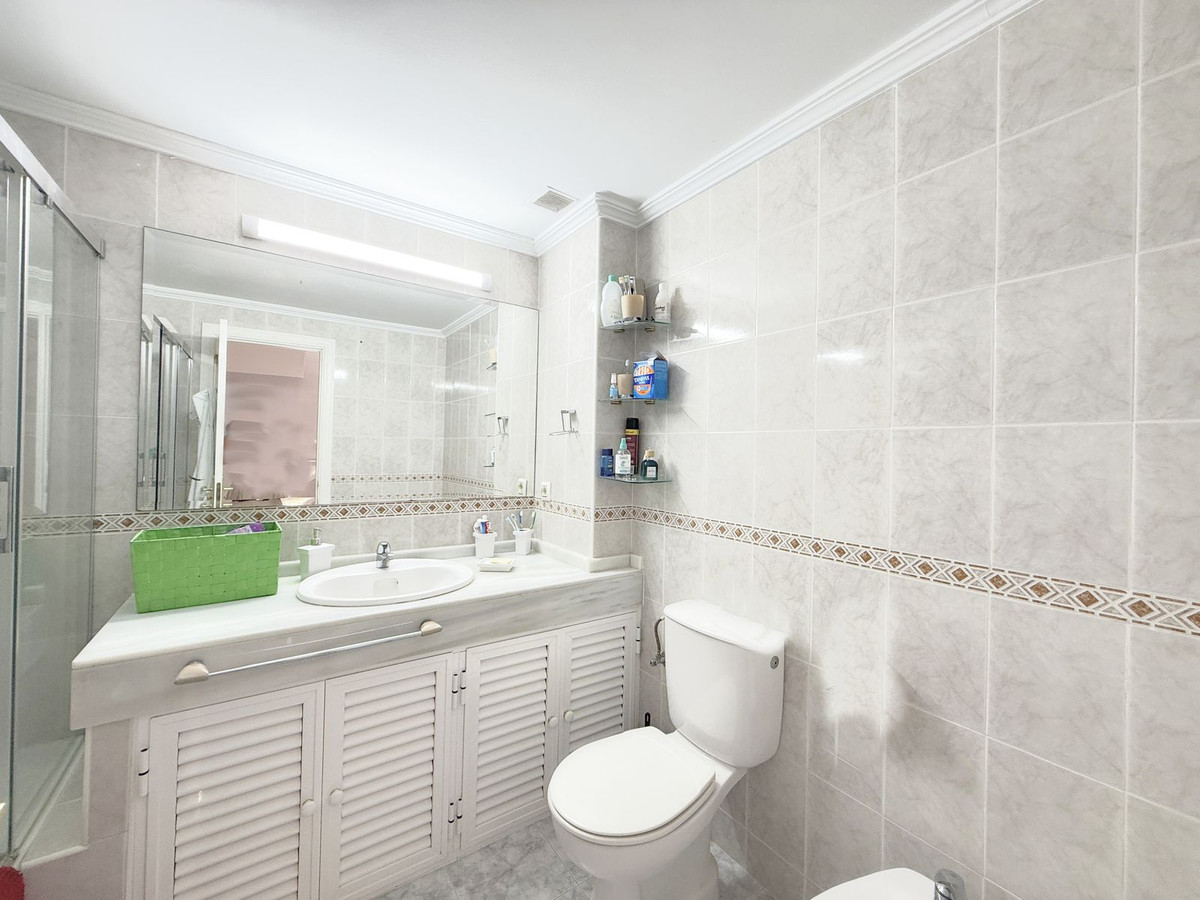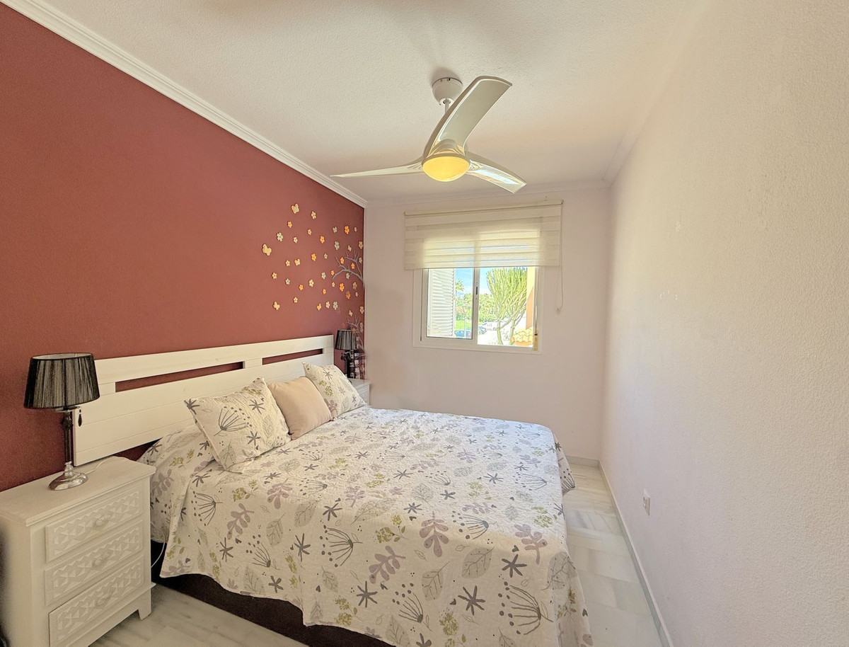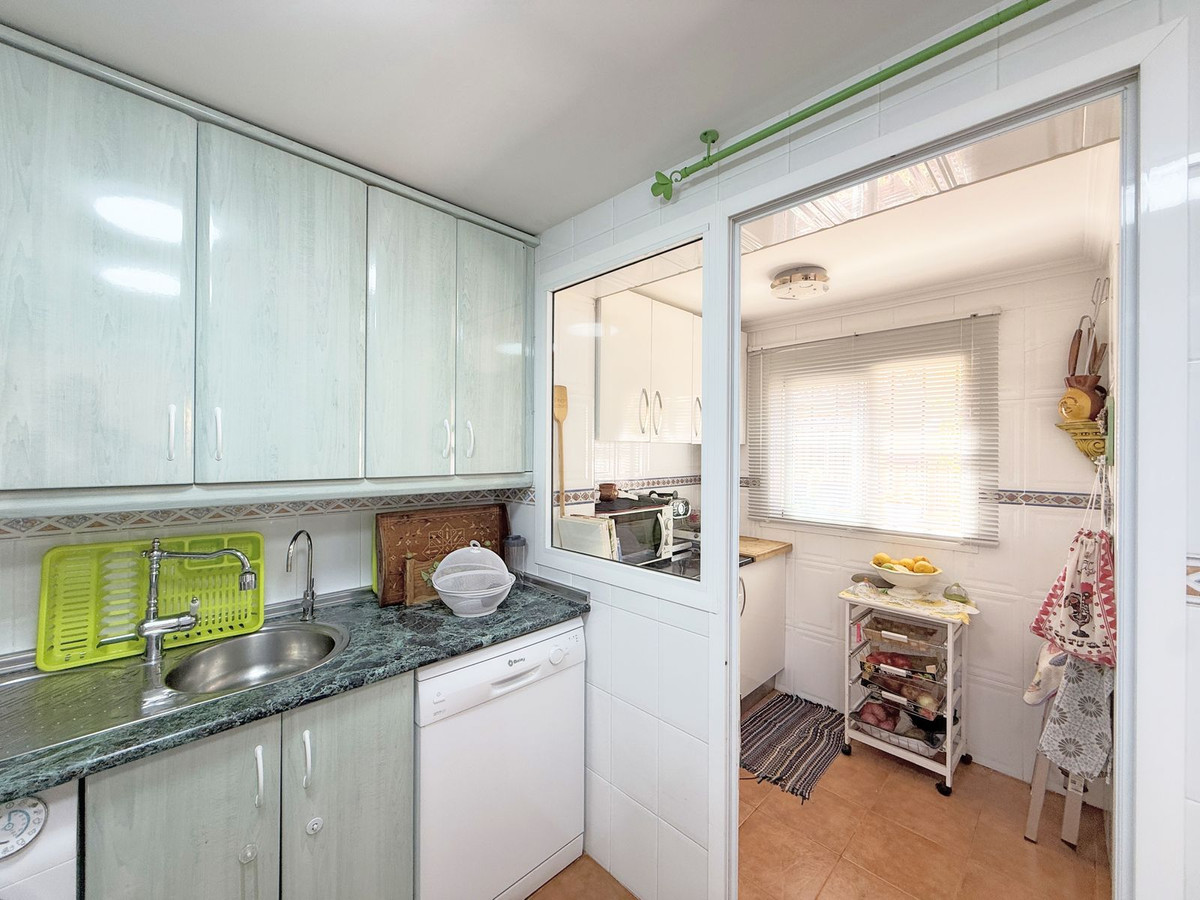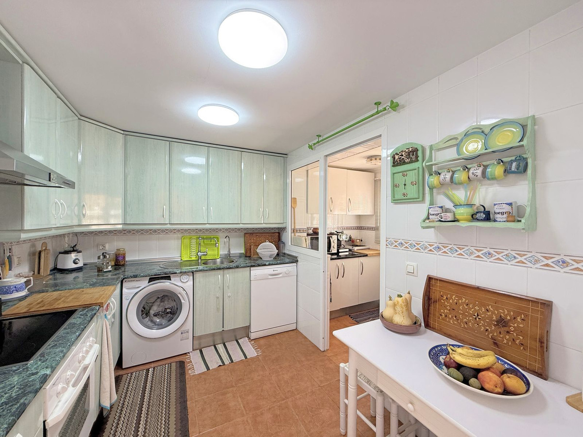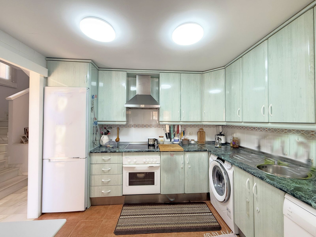 The property is distributed over two floors plus a spacious rooftop solarium with stunning sea views. It offers 3 bright and spacious bedrooms, a cozy living room, and a delightful Andalusian-style patio with fruit trees and direct access to the communal swimming pool and beautifully maintained gardens.