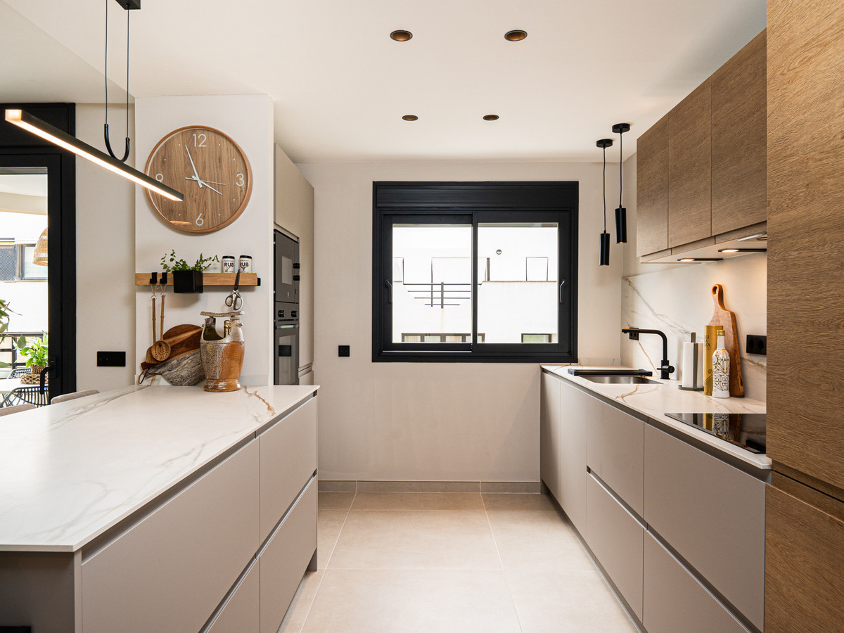 The open-plan kitchen connects smoothly to the living and dining areas, creating a spacious and welcoming environment. Premium appliances, generous storage, and a sleek breakfast bar make the kitchen both functional and stylish. Sliding doors open to a private terrace, perfect for outdoor dining or relaxing in the afternoon sun. The apartment’s neutral tones, natural textures, and clean lines create a calm and sophisticated atmosphere throughout.
