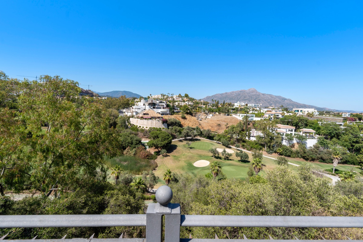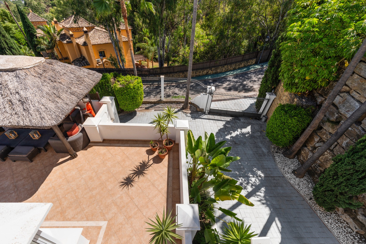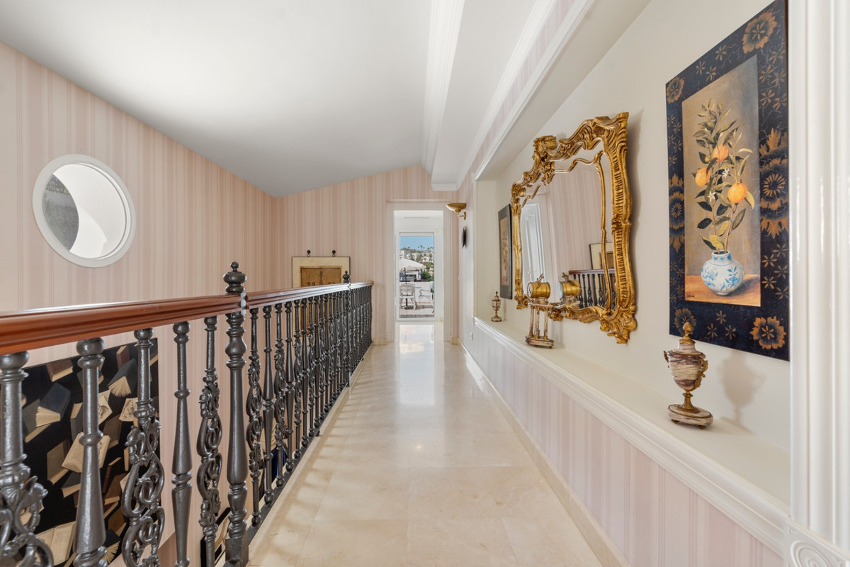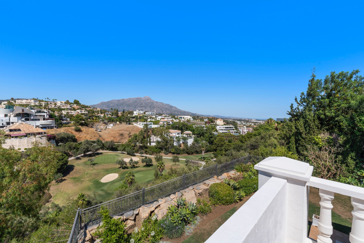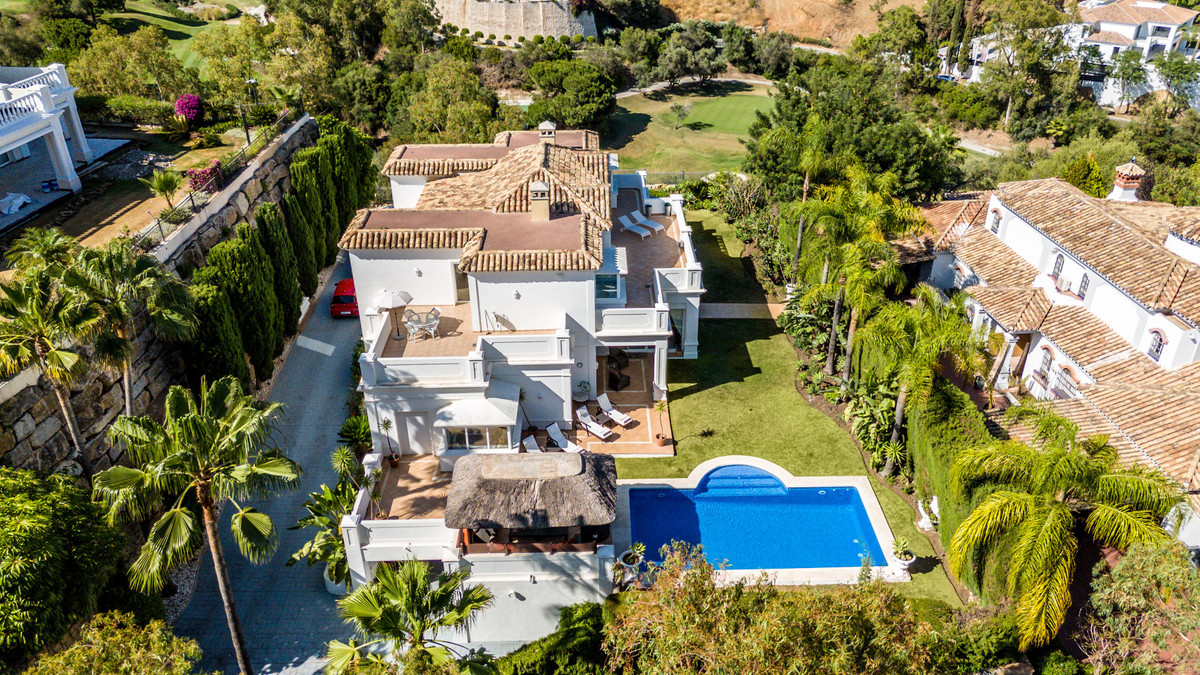 Villa Alto sits proudly within one of the coast’s most exclusive gated communities, surrounded by a world-class golf course and protected by 24-hour security. This elegant five-bedroom villa combines privacy, space, and style across three levels, offering panoramic views of La Concha mountain and the lush golf valley.