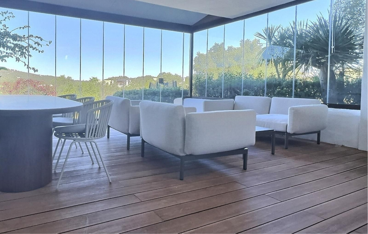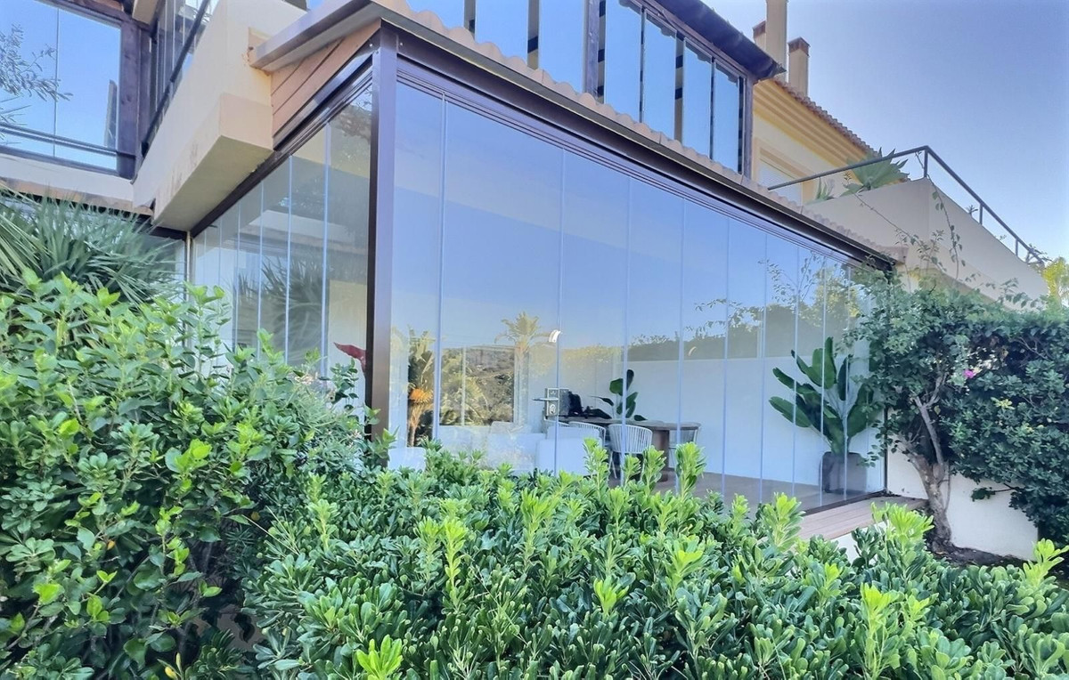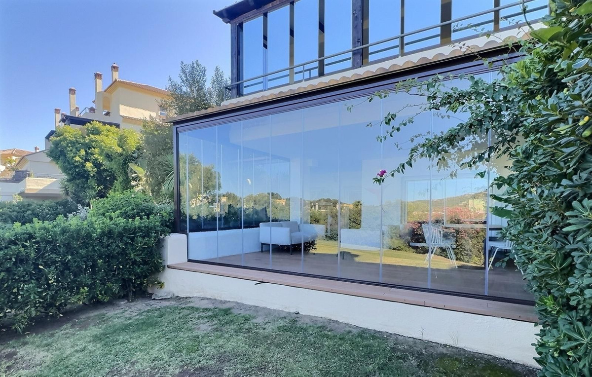 The master bedroom and living room open onto a stunning covered terrace, fully enclosed with glass curtains, connecting to the private garden and communal areas. West-facing, it enjoys beautiful countryside views and breathtaking sunsets. The other two bedrooms share an additional terrace facing east, perfect for the morning sun.