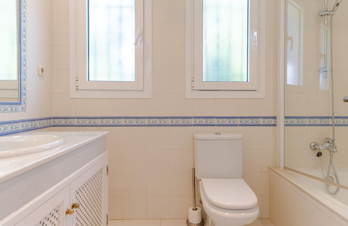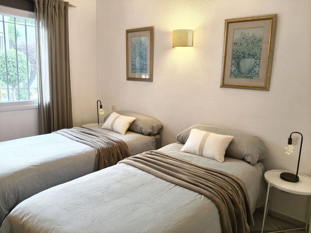 The Master bedroom with a super king bed equipped with double panelled wardrobes and offers views to the tropical gardens - Adjacent luxurious Andalucian master bathroom designed with an immaculate white marble integrated vanity unit with purpose built white carpentry, a porcelain bathtub with shower, double windows and integrated spots to the ceiling. A further guest bedroom with ensuite bathroom offers 2 beds with beautiful garden views.