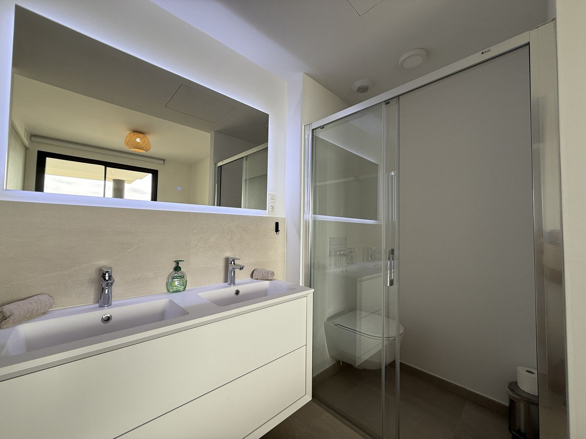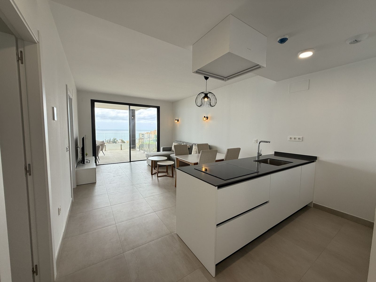 The apartment features a bright open-plan living and dining area with direct access to a spacious terrace showcasing panoramic views of the Mediterranean. The contemporary kitchen is fully equipped, and both bedrooms are generously sized, with the master suite offering an en-suite bathroom and built-in wardrobes. The finishes are of high quality throughout, making this a move-in-ready home.
